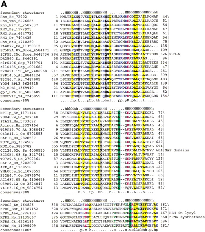 (A) Multiple sequence alignment of different classes of HEH domains. Each of the alignments is colored according to a separate consensus using the rules described in the legend to Figure 2. The secondary structure shown above the alignment was derived from the structures of Rho, Endo-VII and K-TRS. For the SAP domains, the structure was predicted using the PHD program. The species abbreviations are the same as in Figure 2; those not present in Figure2 are : Ec, Escherichia coli; Ssp, Synechocystis sp.; Tma, Thermotoga maritima; Dr, Deinococcus radiodurans; Aae, Aquifex aeolicus; BPL2, lactococcal Bacteriophage L2; BPA118, Listeria bacteriophage A118; T4, Bacteriophage T4; Miclu, Micrococcus luteus; Ce,Caenorhabditis elegans; Ct, Chlamydia trachomatis; Hp, Helicobacter pylori; Bst, Bacillus stearothermophilus. (B) Structures and models of different forms of the HEH domain shown in the alignment. The NH2 (N) and COOH (C) termini of the HEH domains are indicated.