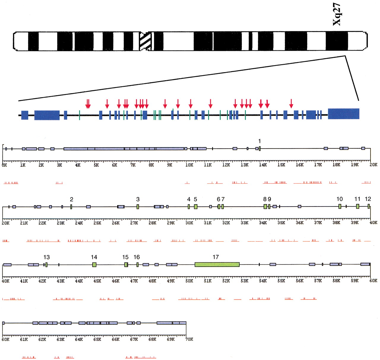 The genomic structure of the FMR1 region. The ideogram of the X chromosome shows the location of the FMR1 region, subsequently magnified to show the region we studied. The green bars identify FMR1 exons, numbered accordingly. The blue bars represent regions masked byRepeatMasker. The red arrows locate the SNPs found among the 20 humans sampled. This region is further magnified below, with the modification that the red bars are the segments screened for variation and the thin red hash marks identify all differences from the reference sequence.
