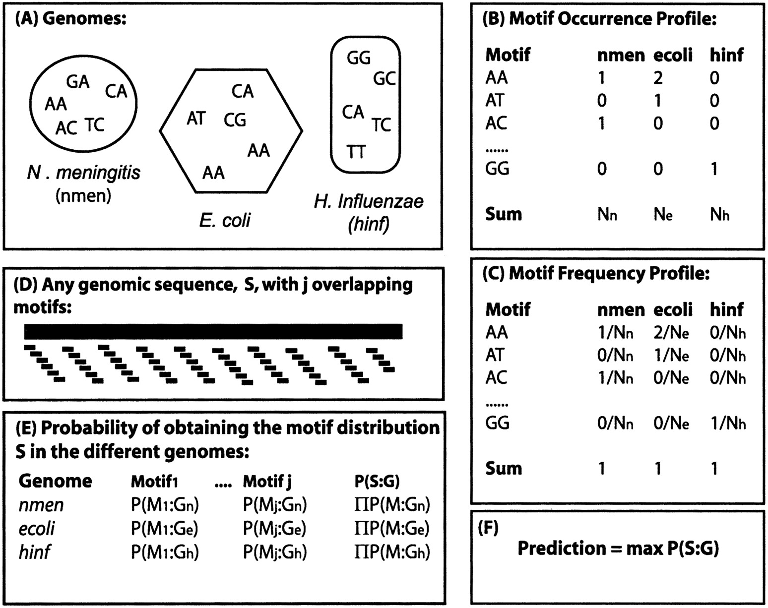 Outline of the Bayesian classifier. (A) For a given motif length (in this figure, two base pairs), the occurrence of all overlapping motifs for each genome is recorded in the motif occurrence profile (B). The motif occurrence profile for each genome is then transformed to a motif frequency profile (C) by dividing each motif occurrence by the total number of motifs in that genome. (D) A sequence, S, of arbitrary length is taken at random from any of the genomes, consisting of a number of j overlapping motifs. (E) The probability of obtaining the motif distribution present in sequence S is separately calculated for each genome and motif. For example, the probability of obtaining motifi in E. coli, P(Mi:Ge) is estimated by the frequency of that motif in the E. coligenome, calculated in (C). The probability of obtaining the motif distribution present in sequence S is then estimated as the product of the individual probabilities of obtaining each motif (E). The classifier predicts the most probable genomic origin (F), the genome with the highest probability P(S:G).