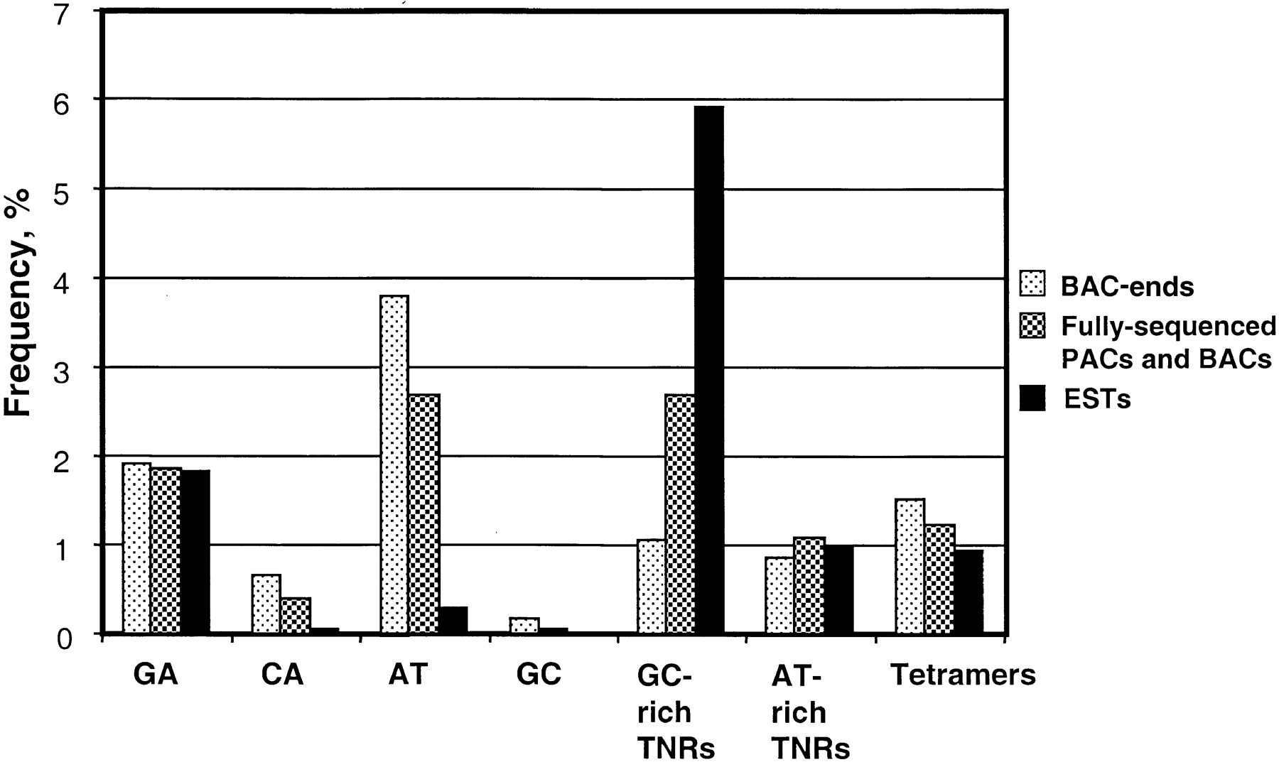 Relative frequency of Class I microsatellites with different simple sequence repeat motifs in three sets of DNA sequence data.