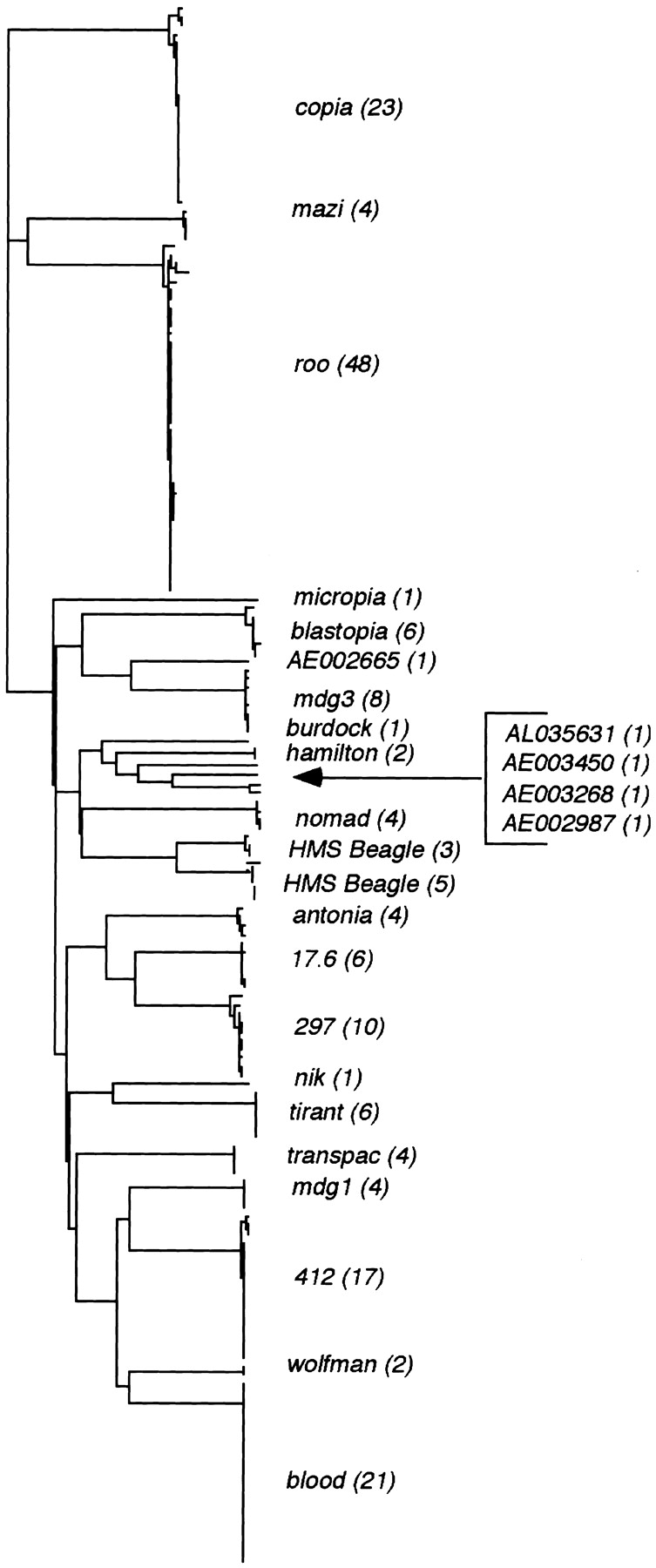Neighbor-joining phylogenetic tree of the ClustalWalignment of LTR retrotransposon nucleotide sequences. This tree indicates the high level of sequence homology within a family of elements. For clarity, the element families are listed once with the number of elements in each family in parentheses. Unclassified elements are identified by the accession number in which they are located.