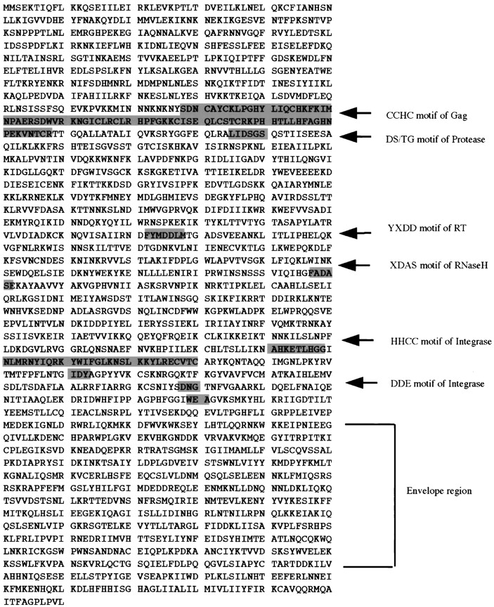Translation of roo reveals one long ORF. The characteristic amino acid motifs of Gag, Protease, RT, Ribonuclease H (Rnase H), and Integrase of LTR retrotransposons and retroviruses (McClure 1991) are shaded and labeled in the margin. The region containing motifs similar to other Envelope proteins (Lerat and Capy 1999) is indicated near the end of the ORF.