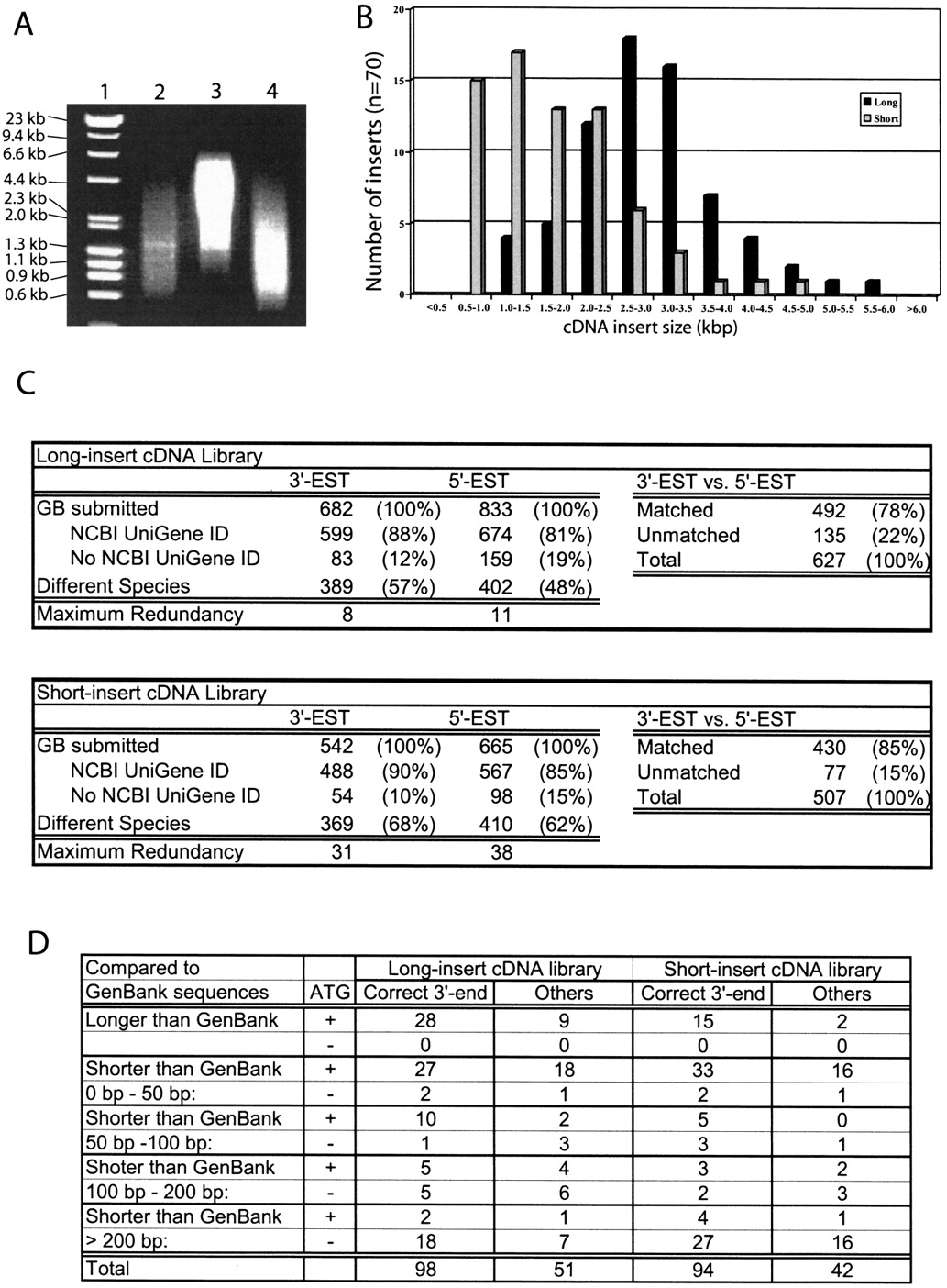 Application of the new method to the construction of newborn mouse kidney DNA libraries. (A) Size distributions of amplified cDNAs were analyzed on 0.7% agarose gels. Lane 1, DNA size marker. Lane 2, previous method. The cDNAs were tagged by LL-Sal3, and amplified by the PCR condition VI with 1 μL of LL-Sal3A primer. Lane 3, new method. The cDNAs were tagged with LL-Sal4 and amplified by the PCR condition III with 1 μL of primer S. Lane4, new method. The cDNAs were tagged with LL-Sal4 and amplified by the PCR condition V with 1 μL of primer L. (B) Comparison of size distributions of cDNA inserts between the short and long cDNA libraries. (C) Analysis of the complexity of cDNA libraries based on NCBI Mouse UniGene Index. (D) Sequence analyses of the long- and short-insert cDNA libraries. “Correct 3′-end” means that the 3′ end of cDNA sequence shows exact match to the 3′-end sequence of GenBank entry. “Others” means that the 3′ end of cDNA sequences does not match to the 3′ end sequence of GenBank entry. This can happen when either correct 3′-end sequences are not reported in the GenBank or our cDNA clones are truncated at 3′ ends. Although most cDNA clones have polyA sequence at the 3′ end, possible 3′-end truncation by Oligo(dT) mispriming cannot be excluded.