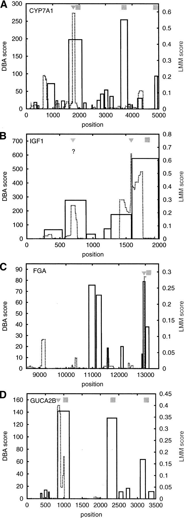 Combining the liver model with phylogenetic footprinting for selected sequences. The sequence similarity between human and rodent sequences as determined with DBA (Jareborg et al. 1999) is shown as a solid black line. The position-dependent LMM score of the human sequence centered with respect to a 200-bp window is shown as a broken gray line. Documented regulatory regions, depicted by triangles, are characterized by strong score for both DBA and LMM. Boxes show annotated exons that possess a high level of cross species conservation, reflected by a high DBA score. The position with respect to the human sequence is shown along the abscissa. Fig. 4A addresses CYP7A1 (human accession L13460, rat U01962). Fig. 4B addresses IGF1 (human S85346[identical with M12659], mouse Y18062).