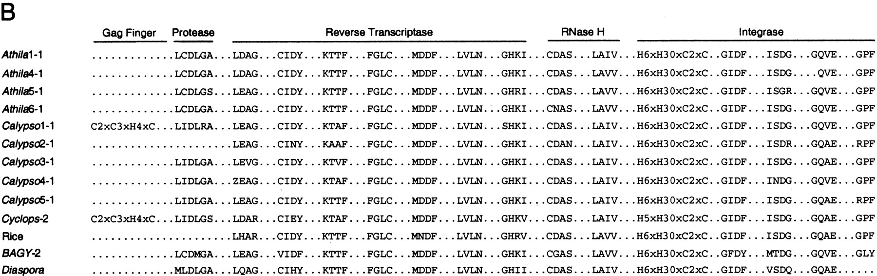 Gag-Pol of the Athila group elements. (A) The structural organization of the Athila4 and Calypsoconsensus elements are shown along with individual-related elements from pea (Cyclops-2; Chavanne et al. 1998), barley (BAGY-2; Shirasu et al. 2000), rice (accession numberAP003054, 36238–53391 bp; an inserted element was removed for the diagram), and soybean (Diaspora, accession number AF095730). Below Cyclops-2 is a graph depicting amino acid identity along the length of Gag-Pol. Light gray depicts protease (PR), medium gray depicts reverse transcriptase (RT), and dark gray depicts integrase (IN). All other aspects of the figure are as described in the Fig. 2legend. (B ) Amino acid sequence signatures of Gag-Pol. The sequence domains are described in the text. Motifs are shown that define the seven conserved domains of reverse transcriptase (Xiong and Eickbush 1990). For integrase, the zinc-binding domain is shown, as are signatures for the DD35E domain (Fayet et al. 1990) and the GPY/F motif (Malik and Eickbush 1999).