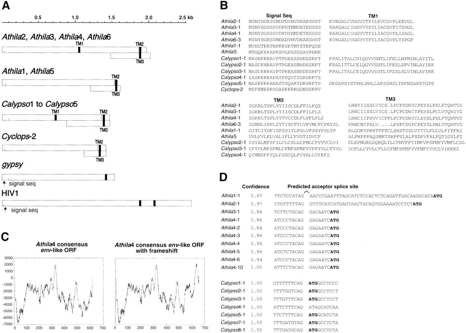 Features of the Athila group env-like ORFs. (A) Generalized organization of env-like ORFs from the Arabidopsis thaliana Athila group elements, the soybean Calypso elements, Cyclops-2 of pea,gypsy of Drosophila melanogaster, and HIV1. The open boxes indicate ORFs. Arrowheads indicate signal sequences. Black boxes indicate transmembrane domains. Vertical lines within boxes denote stop codons. The first methionine within each ORF is indicated by a short line. (B) Amino acid sequences of putative signal sequences at the N termini and predicted transmembrane domains. (C)TMpred output for the Athila4 consensusenvelope (env)-like ORF with and without a frameshift at the C terminus. Values above 500 (on the X-axis) are significant and indicate likely transmembrane domains (Hofmann and Stoffel 1993). The Y-axis indicates amino acid sequence position. (D) Sequences at the putative splice acceptor site of the Arabidopsis thaliana Athila and Calypsoelements. The confidence level indicates the output forNetGene 2 (Brunak et al. 1991; Hebsgaard et al. 1996). The first methionine in the env-like ORF is in bold.