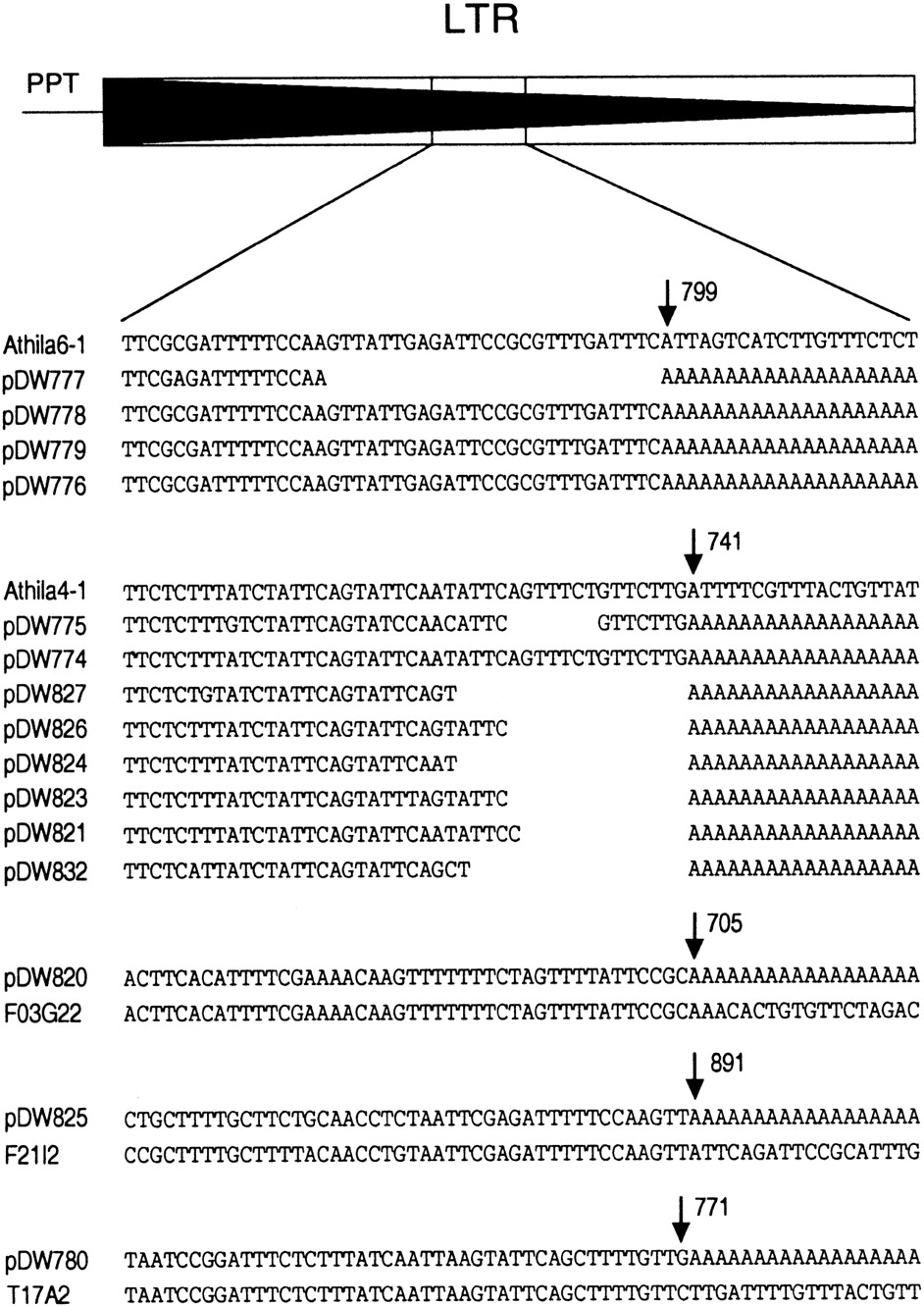 Transcription termination sites of Arabidopsis thaliana Athilagroup elements. RNA was isolated from a methylation-deficient strain (ddm1) and amplified by RT-PCR using anAthila4 primer and a poly(T) primer/adaptor. PCR products were cloned and sequenced. At the top of the diagram is a genericAthila LTR with the region denoted wherein the transcripts terminate. Clones are listed that match the Athila6 andAthila4 elements. The numbers next to the arrows indicate the base position for transcription termination sites within the LTR. Clones were recovered with variable termination sites, as indicated by the gaps in the alignment. Three clones (pDW820, pDW825, and pDW780) match highly degenerate, unclassified Athila elements, and the numbers for the BACs that carry these elements are provided.