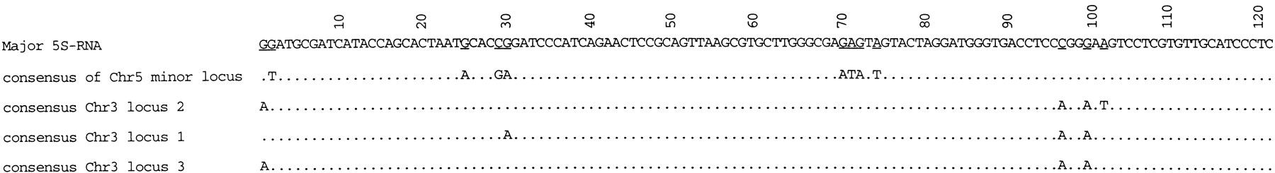 Alignment of the transcribed region consensus sequences of 24 sequences from chromosome 5 minor block, 60 sequences from locus 2, 15 sequences from locus 1, and seven sequences from locus 3 of chromosome 3 with the major 5S RNA transcript. Dots (.) indicate identical residues. Different residues are underlined in the major 5S RNA sequence.