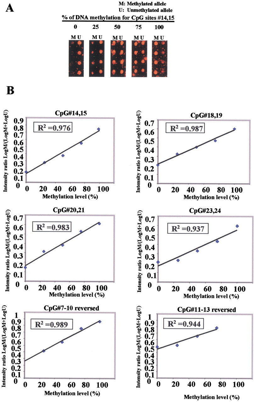 Standardization curve for MSO assays. (A) Mixtures of in vitro-methylated and untreated control DNA were prepared and amplified by PCR using bisulfite primers for the human ERα CpG island (see Methods). Target DNA was hybridized to MSO microarray. The Cy5 red fluorescence signals of the methylated (M) and unmethylated (U) alleles for CpG#14,15 are shown, reflecting the indicated percentage of methylation. (B) A calibration curve for measuring methylation changes at the ERα CpG sites. The intensity ratios (Y-axis) represent signal intensities of log M/log M+log U. The linear distribution shows that measurements of the different mixtures are well distinguished and can be used to determine the methylation status for test samples. The MSO assays were independently repeated three times with different target preparations.