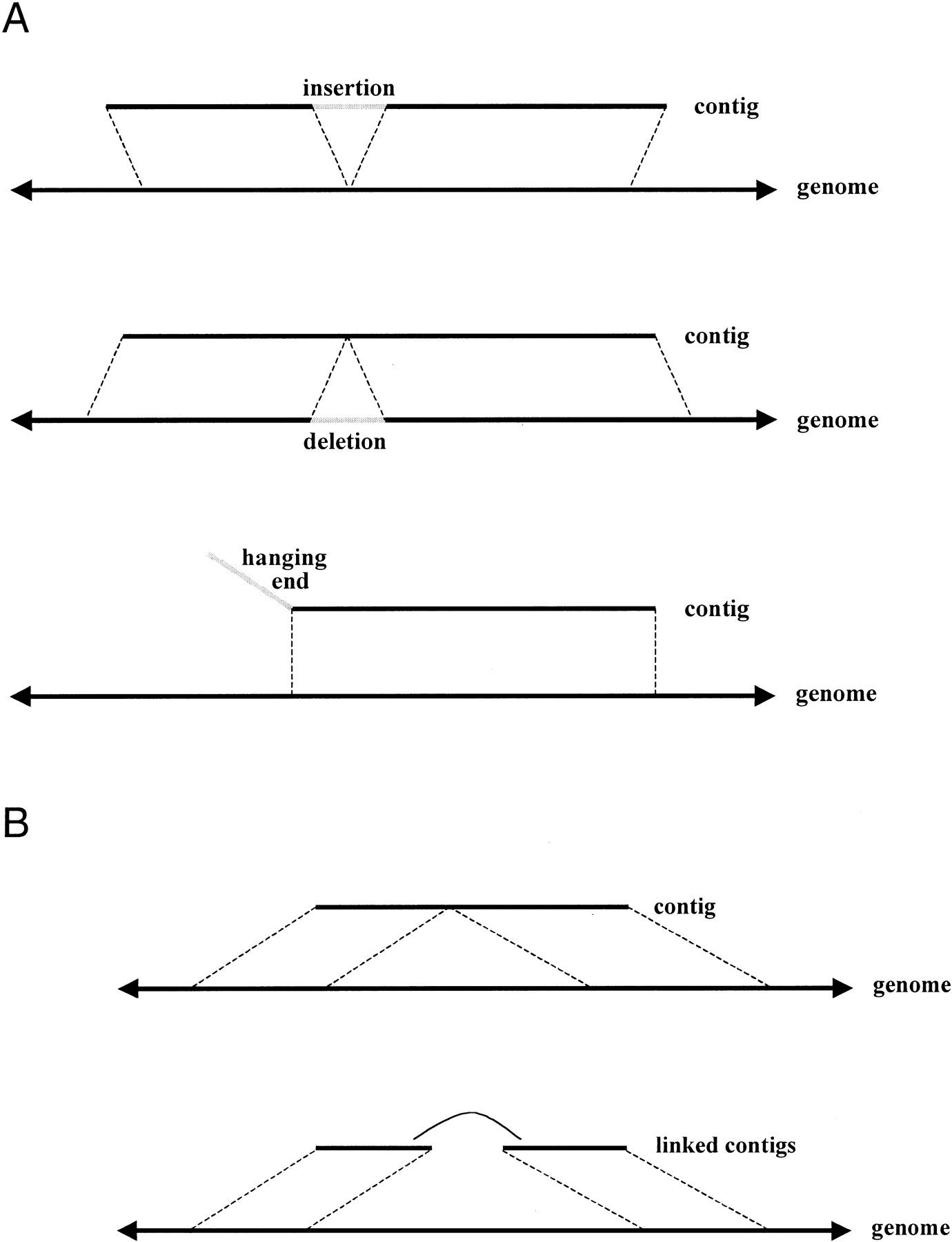 Types of misassemblies. (A) Three types of simple minor misassemblies are shown: insertions, deletions, and hanging ends. In all three cases, a contiguous segment (of a contig or the genome) of length less than 10 kb does not align in the expected location (with the genome or contig). This segment could be aligned at some alternate location in most cases, although we do not do this in practice. Compound minor misassemblies (e.g., contigs having two insertions) are reported as multiple misassembly events. (B) Two types of major misassemblies are shown. In the first type, two pieces of a contig align to distant parts of the genome (if one piece is very short, we instead report a hanging end, as in A). In the second type, adjacent contigs in a supercontig are aligned to distant parts of the genome. In practice, what we typically encounter is a hybrid between these two types: a contig that lies in the middle of a supercontig is split as in the first type. We call this hybrid the standard major misassembly.