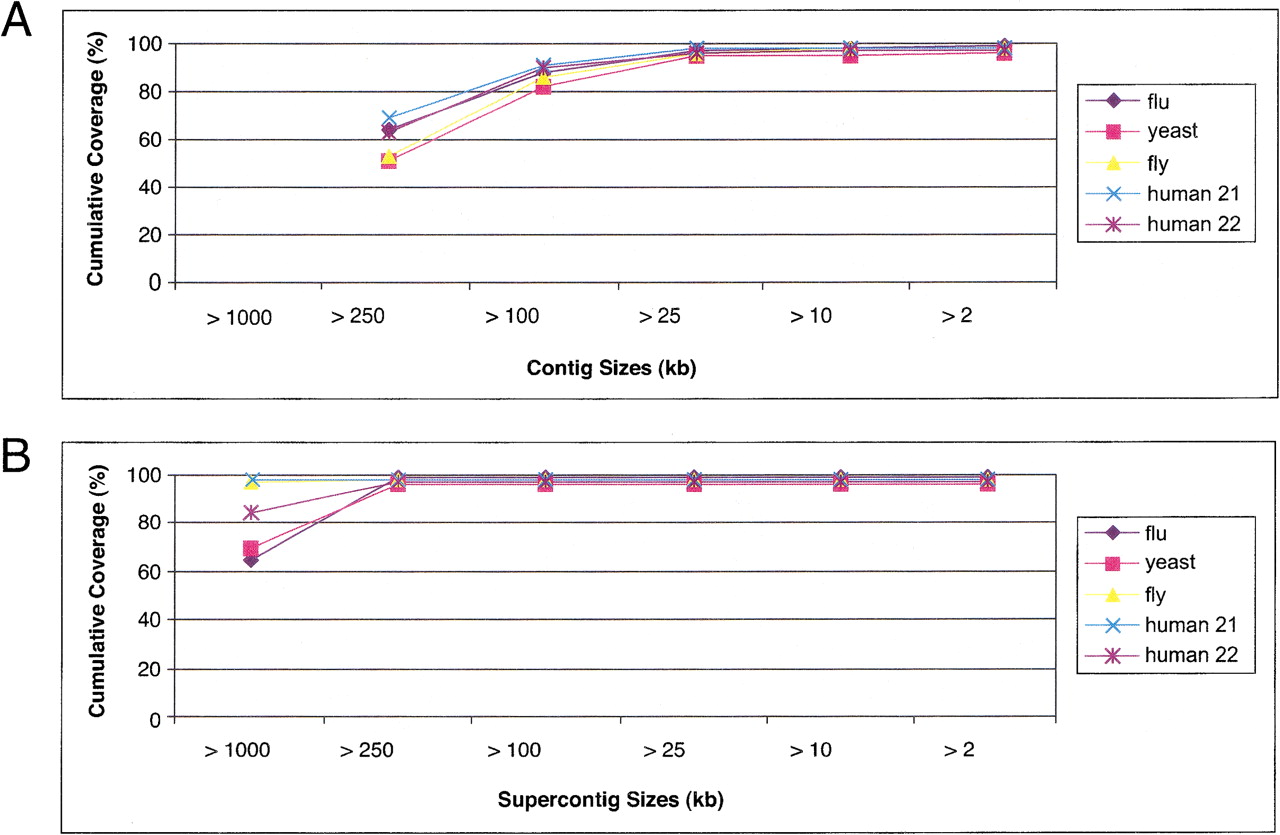 Coverage in assemblies of 10-fold simulated reads. (A) Coverage of the genome with contigs. Contigs of sizes >250 kb cover 50%–70% of the genome. (B) Coverage of the genome with supercontigs. Supercontigs of size >1 Mb cover at least 65% of the genome in all test examples.
