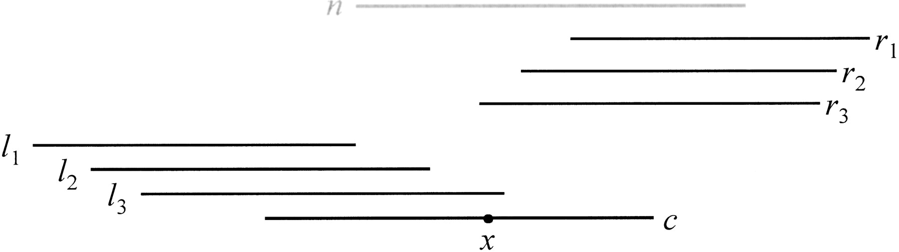 Detection of chimeric reads. Reads l 1,l 2, l 3, r 1,r 2, and r 3, and the absence of a read n (having long overlaps on both sides of a pointx) suggest that read c may be chimeric, consisting of the juxtaposition of two disparate genomic segments: one corresponding to the part of c before x, and one corresponding to the part of c after x. We call x thepoint of chimerism of c. Note that readsl 3 and r 3 extend slightly beyondx, as often happens for real chimeric reads.