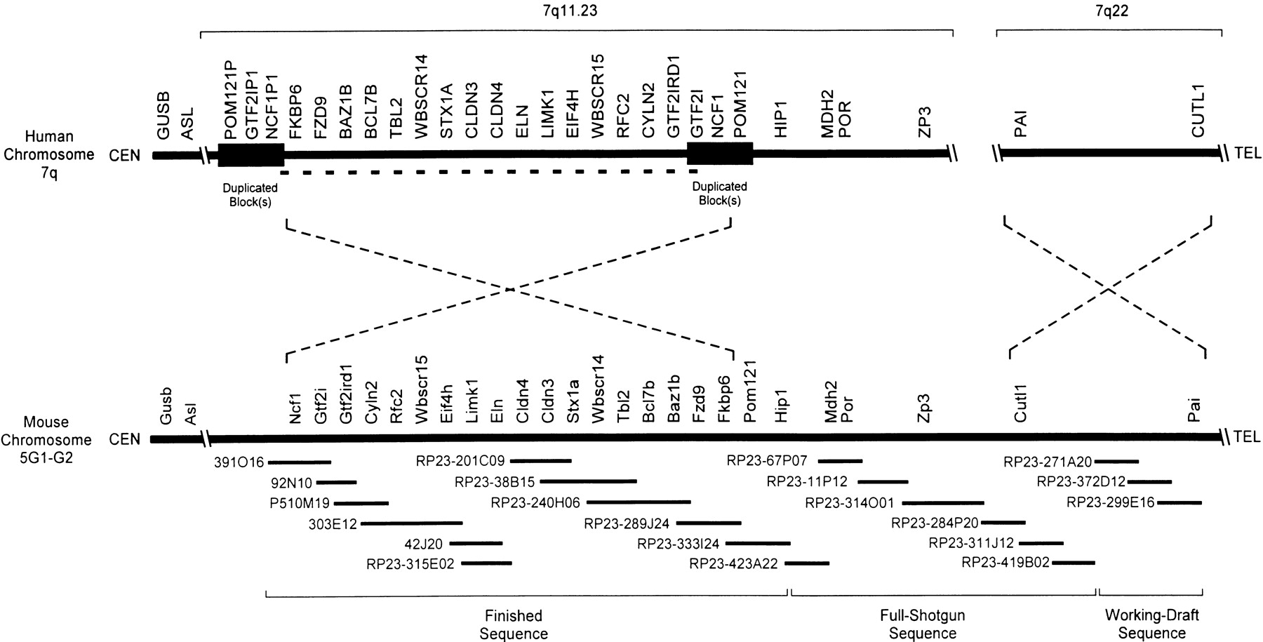 Long-range organization of human and mouse Williams syndrome (WS) regions. A physical map of the WS regions on human chromosome 7q and mouse chromosome 5G is depicted emphasizing the positions of the known genes residing within and flanking the interval commonly deleted in WS (DeSilva et al. 1999; Francke 1999; Hockenhull et al. 1999; Osborne 1999; Korenberg et al. 2000; Peoples et al. 2000; Valero et al. 2000). In the human WS region, this interval spans ∼1.6 Mb (indicated by a bold dashed line) and is flanked by duplicated blocks of DNA of near-identical sequence (estimated at ∼300 kb in size; indicated by dark rectangles). The relative positions of the centromere (CEN) and telomere (TEL) are indicated in each case. Note the inverted orientation of the two discontiguous segments of human chromosome 7 relative to the single contiguous segment of mouse chromosome 5G. The relative positions of the known human and mouse genes residing in this region are indicated, with additional details provided in Table 1. Depicted below the map of the mouse WS region are the 21 overlapping BAC/PAC clones selected for sequencing (seehttp://bio.cse.psu.edu/publications/desilva for a complete contig map of the mouse WS region), with the current sequencing status (finished, full shotgun, or working draft) indicated at the bottom (also see Table2). Note that the depicted genomic regions and the BAC/PAC clones are not drawn to scale.
