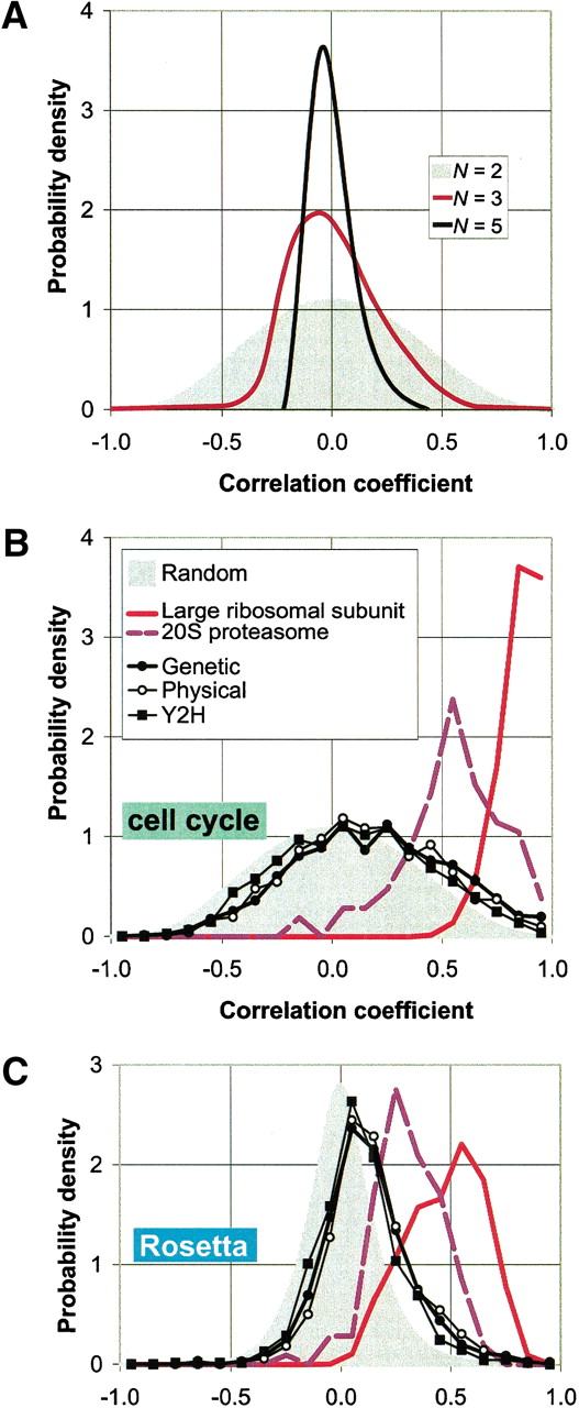 (B and C) The distribution of pair-wise correlations for both the cell cycle (Cho et al. 1998) and the Rosetta experiments (Hughes et al. 2000) in two protein complexes (the ribosome and the proteasome) as well as for the aggregated data sets (genetic, physical and yeast two-hybrid). The gray curves in the background are the control distributions for N = 2 as explained above. The distributions for the ribosome and the proteasome are strongly shifted to the right of the control; this effect is much weaker for the data sets of aggregated interactions.