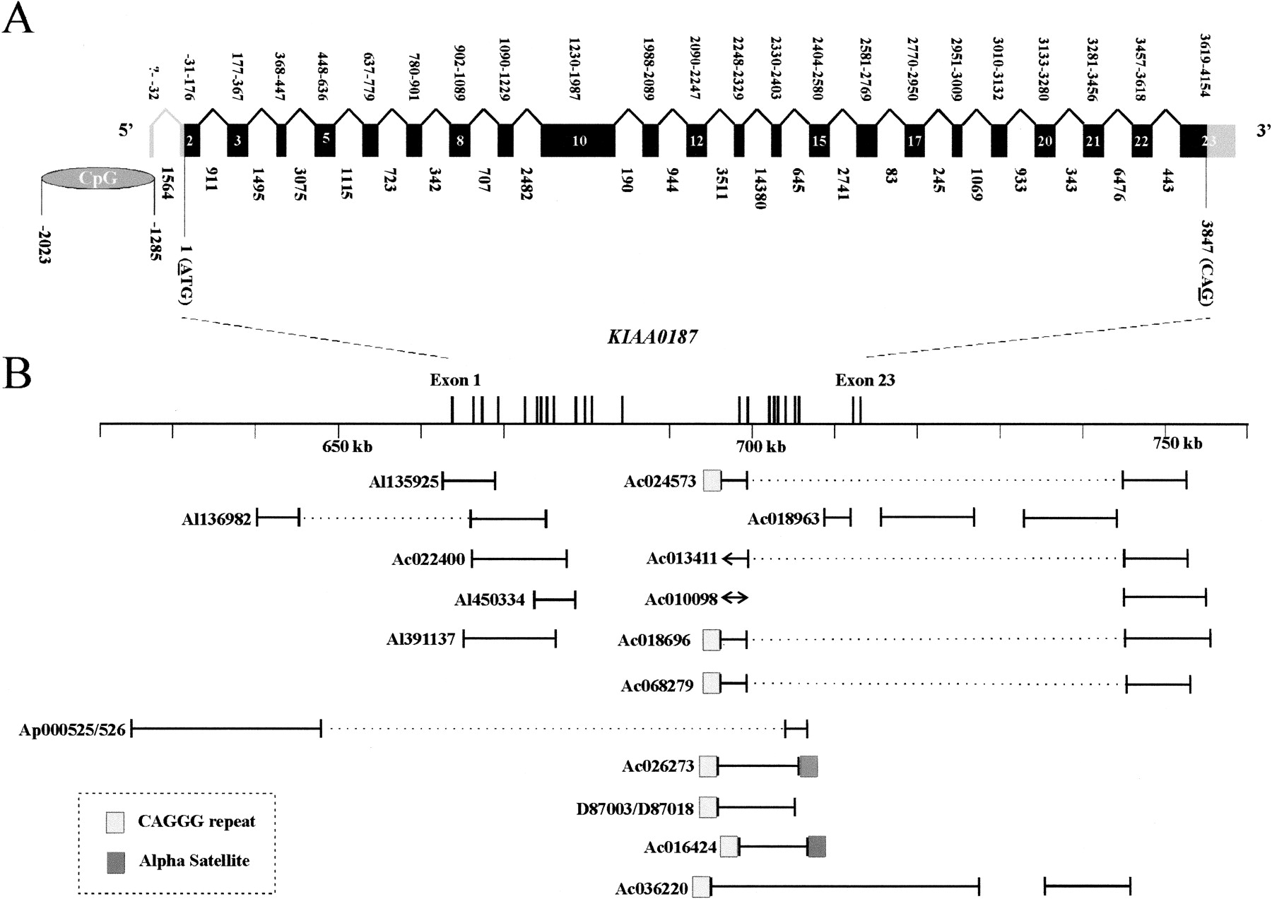 Structure of the KIAA0187 gene and its human paralogs. (A) Schematic of KIAA0187 intron/exon organization. The size of each intron is given in base pairs below the schematic. Nucleotide positions defining each exon are shown above the schematic, taking the A of the initiation codon as position 1 because the transcription start site has not been defined. All splice sites conform to the GT-AG rule. Untranslated regions are indicated in grey, and exon numbers are shown when resolution allows. (B) Physical structure of human paralogs. Solid horizontal lines indicate the extent of paralogy relative to the KIAA0187 gene. Solid vertical bars are shown when the terminus of paralogy can be defined; arrows are shown when it cannot be defined because of the incomplete nature of the sequence. Paralogous sequences that are contiguous within a single clone but are physically separated within theKIAA0187 gene are indicated by a dashed line joining the domains of paralogy. The positions of satellite arrays are shown if they are present within 1 kb of the terminus of paralogy. The chromosome 22 paralogs (ap000525/526 and d87003/d87018) have been characterized previously (Dunham et al. 1999; Eichler et al. 1999; Guy et al. 2000). Physical scale in kilobases is shown relative to Guy et al. (2000).