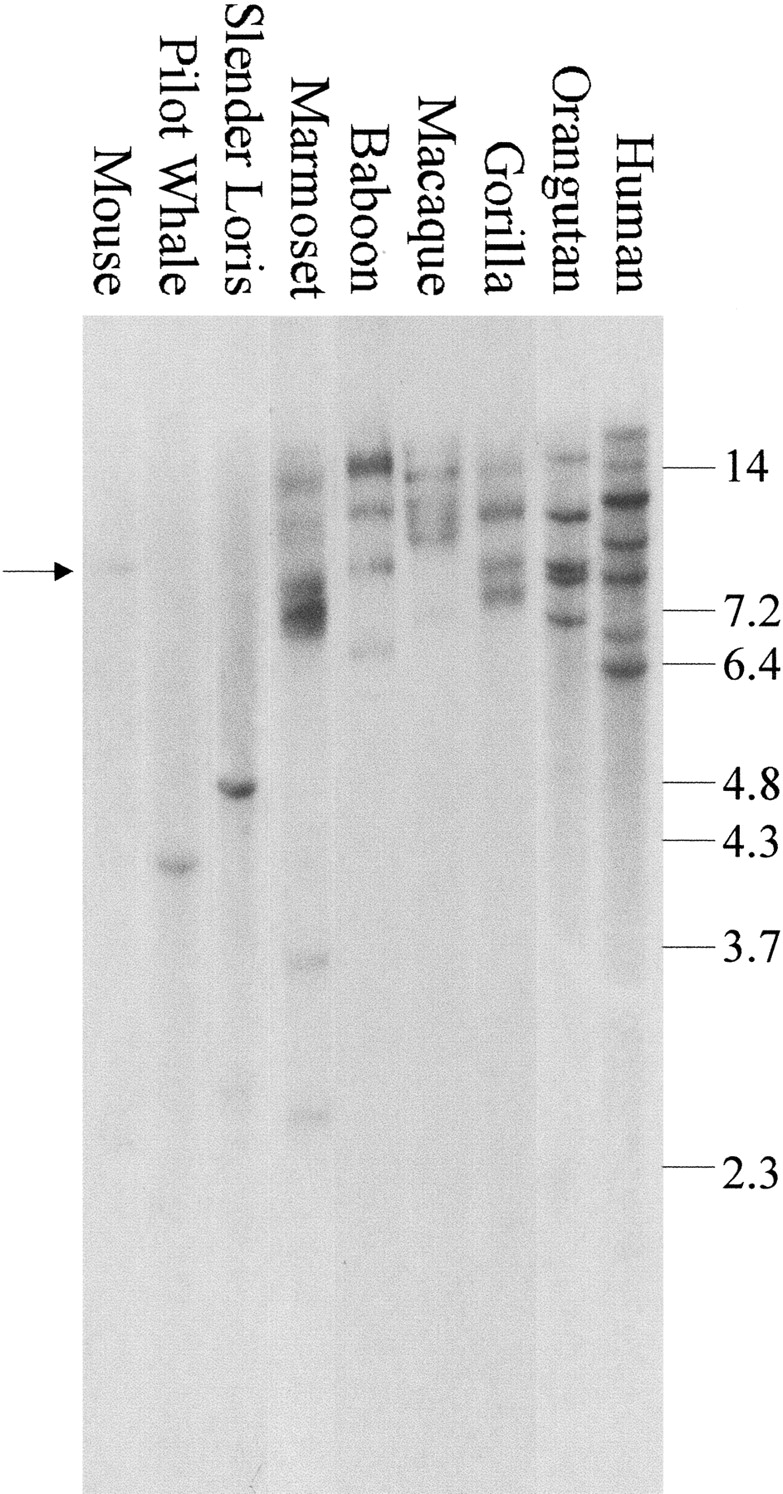 Zoo blot of mammalian and primate species. DNAs were digested withEcoRI and probed with a PCR product specific for exon 3 ofKIAA0187 (see Methods) The weak band of hybridization in mouse is indicated with an arrow. Size of marker fragments are given in kilobase pairs.