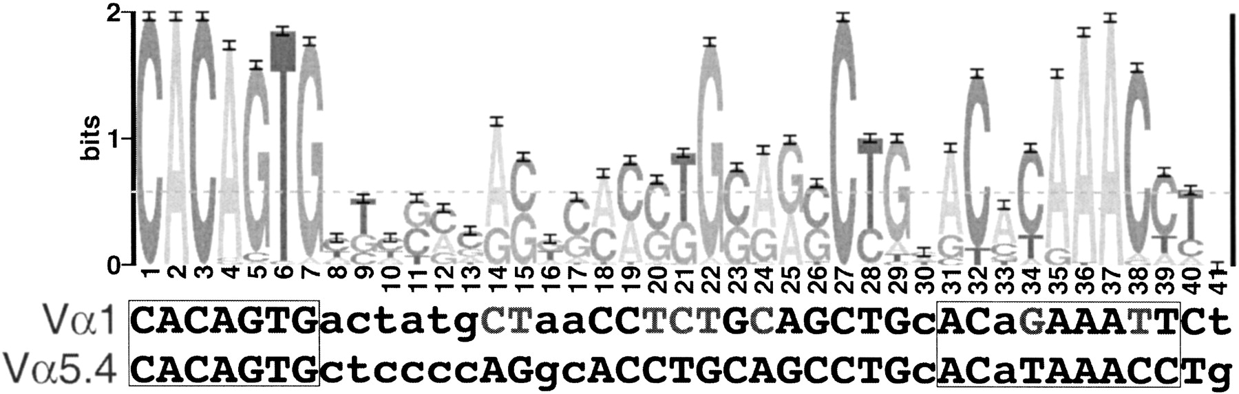 Sequence LOGO of RSS based on a profile of V-gene segments in the TCR-α/δ loci. The divergent RSS for the mouse Vα1 segment is compared to V-gene consensus RSS motifs. Within the Vα1 RSS motif, capital letters indicate residues in which there is strong consensus, and gray letters indicate residues that deviate from consensus.