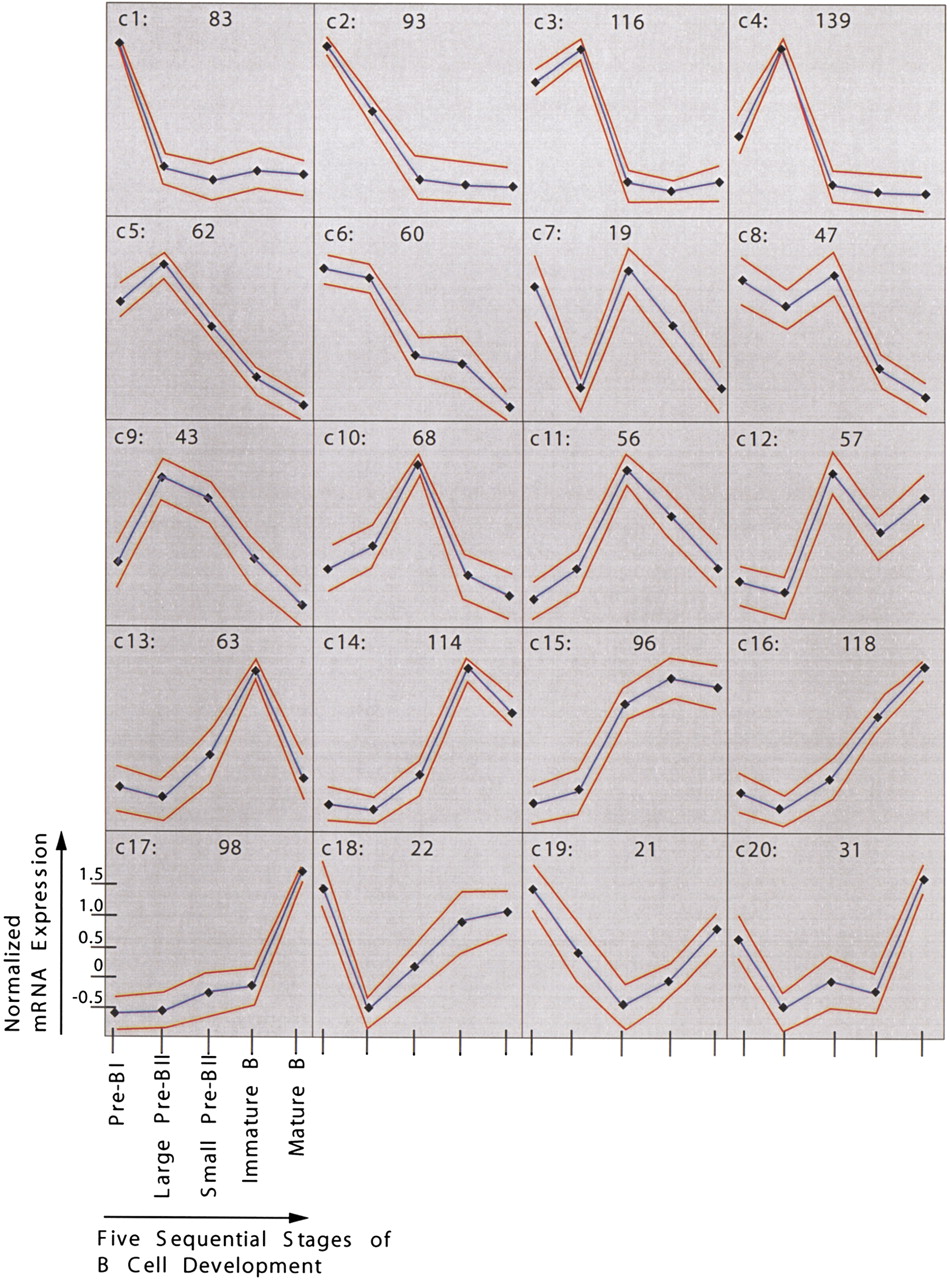 Gene expression patterns identified by self-organizing maps. The cluster numbers are indicated on the top left of each cluster diagram, and the number of genes plus ESTs belonging to every cluster is indicated on the top right. Expression levels are shown on y-axis and developmental stages on x-axis. Dots indicate developmental stages, with the most immature, pre-BI cells on the left and the most mature, that is, mature B cells, on the right. Expression level of each gene was normalized to have mean = 0 and SD = 1 across developmental stages. Blue and red lines indicate expression level means and standard deviations, respectively.