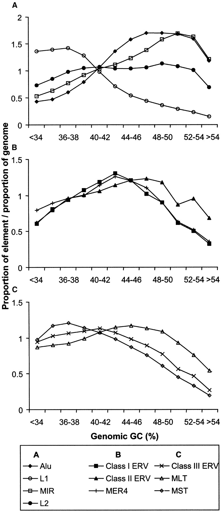 Density of retroelements in different GC fractions in the human genome, calculated over 20-kb windows across the genome sequence. (A–C) The density of various retroelement classes. Those represented in each panel are indicated in the box below the graphs. The bins from left to right correspond to an increasing 2% GC fraction.
