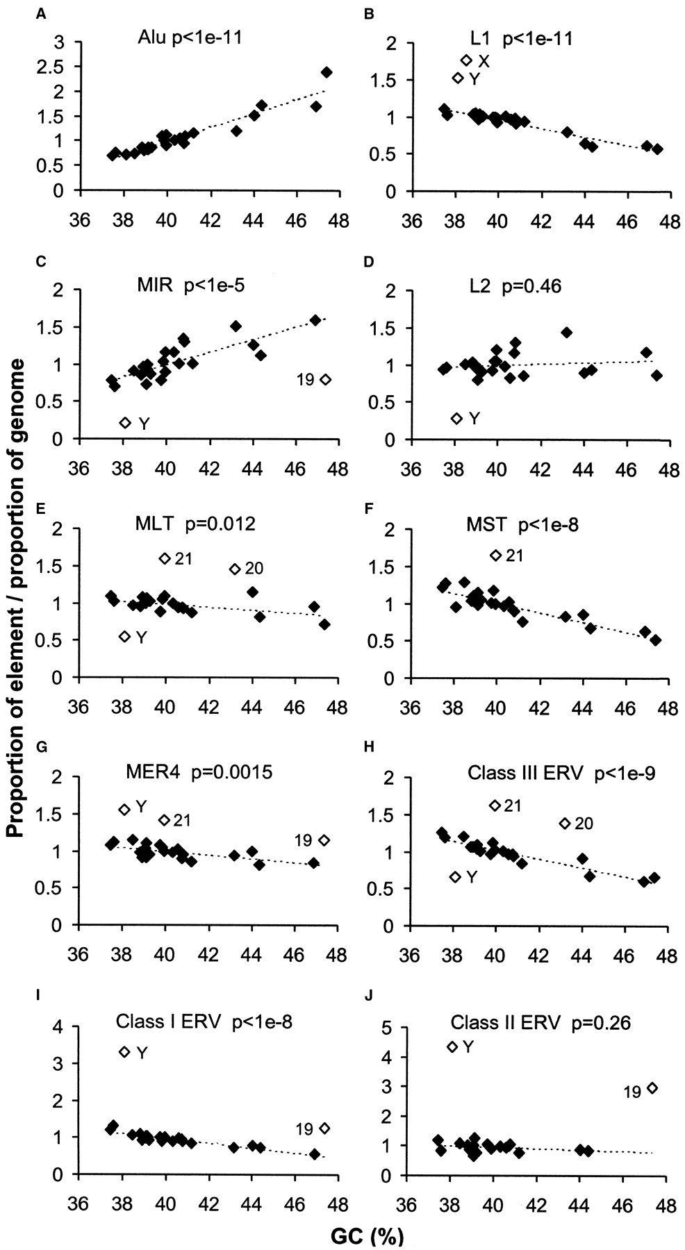 Density of retroelements as a function of average GC content of each human chromosome. The line connecting solid diamonds indicates the general correlation trend between retroelement and GC content of individual chromosomes. The level of significance (P values) of the correlation for each data set is indicated. Open diamonds were excluded from the correlation analysis and indicate over- or underrepresentation of retroelement density on a particular chromosome. Chromosomes 20, 21, and 22 were excluded from the Class II graph (J) because they had <100 supporting elements.