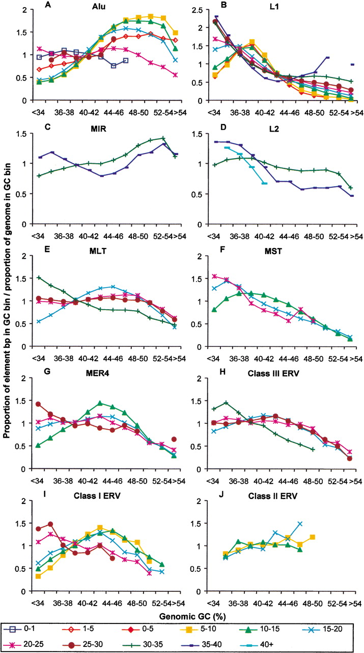 Retroelement densities of different divergence classes in various GC fractions of the human genome. The density distribution of each retroelement divergence cohort was plotted in GC bins as indicated in the legend to Figure 1. The divergence classes are indicated in % divergence from the consensus sequence below the graphs. Data points missing in traces are due to GC bins containing <100 elements. Standard deviations were calculated (see Methods) but are not shown in the interest of clarity.