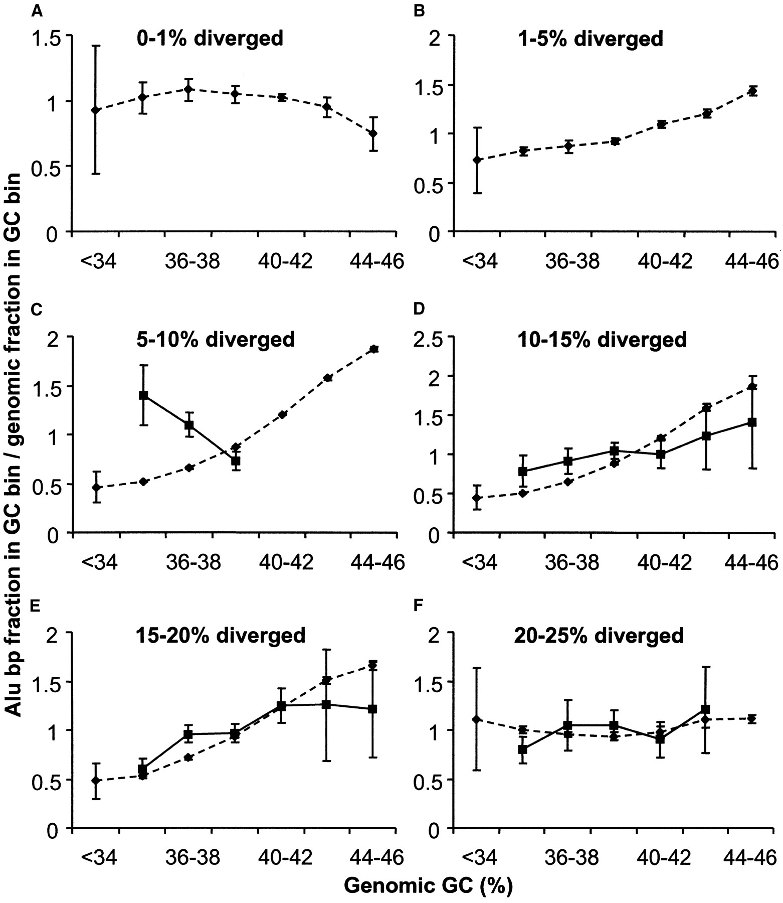 Density of Alu divergence cohorts in different GC fractions on chromosome Y compared with the whole genome. Solid lines indicate Alu elements on chromosome Y; broken lines represent the Alu density in the whole genome. (A–F) The density of specific divergence classes, which are indicated on the top of each panel. There were insufficient numbers of Alu elements on the Y chromosome in the first two divergence cohorts to be plotted in A and B. The density distribution of each Alu divergence class is plotted against the local 20-kb genome GC content. Standard deviations were calculated as described in Methods.