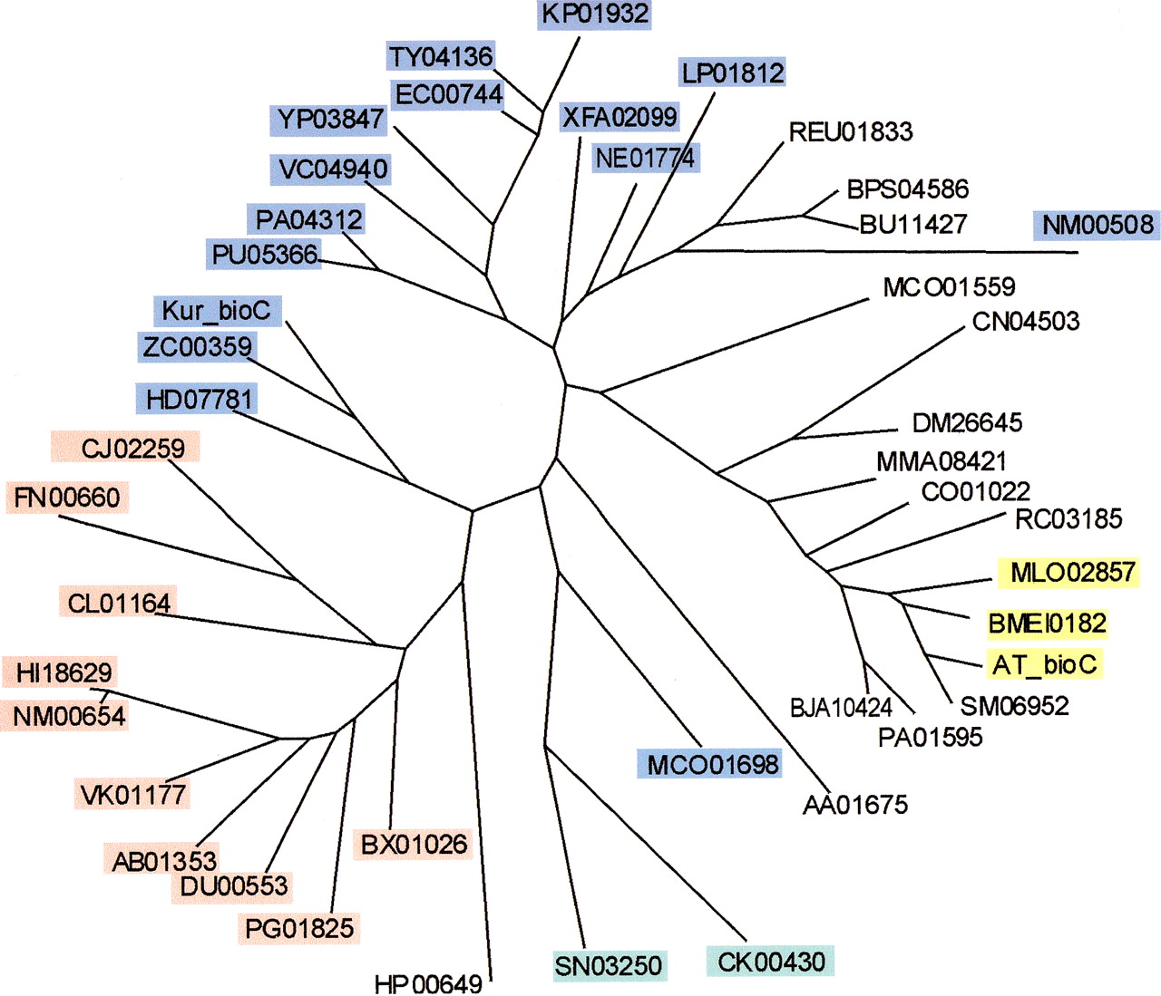 Maximum likelihood tree of BioC. The proteins predicted to be associated with (blue) BioH, (red) BioG, (yellow) BioZ, and (green) BioK. The genome abbreviations are listed in Table 1.