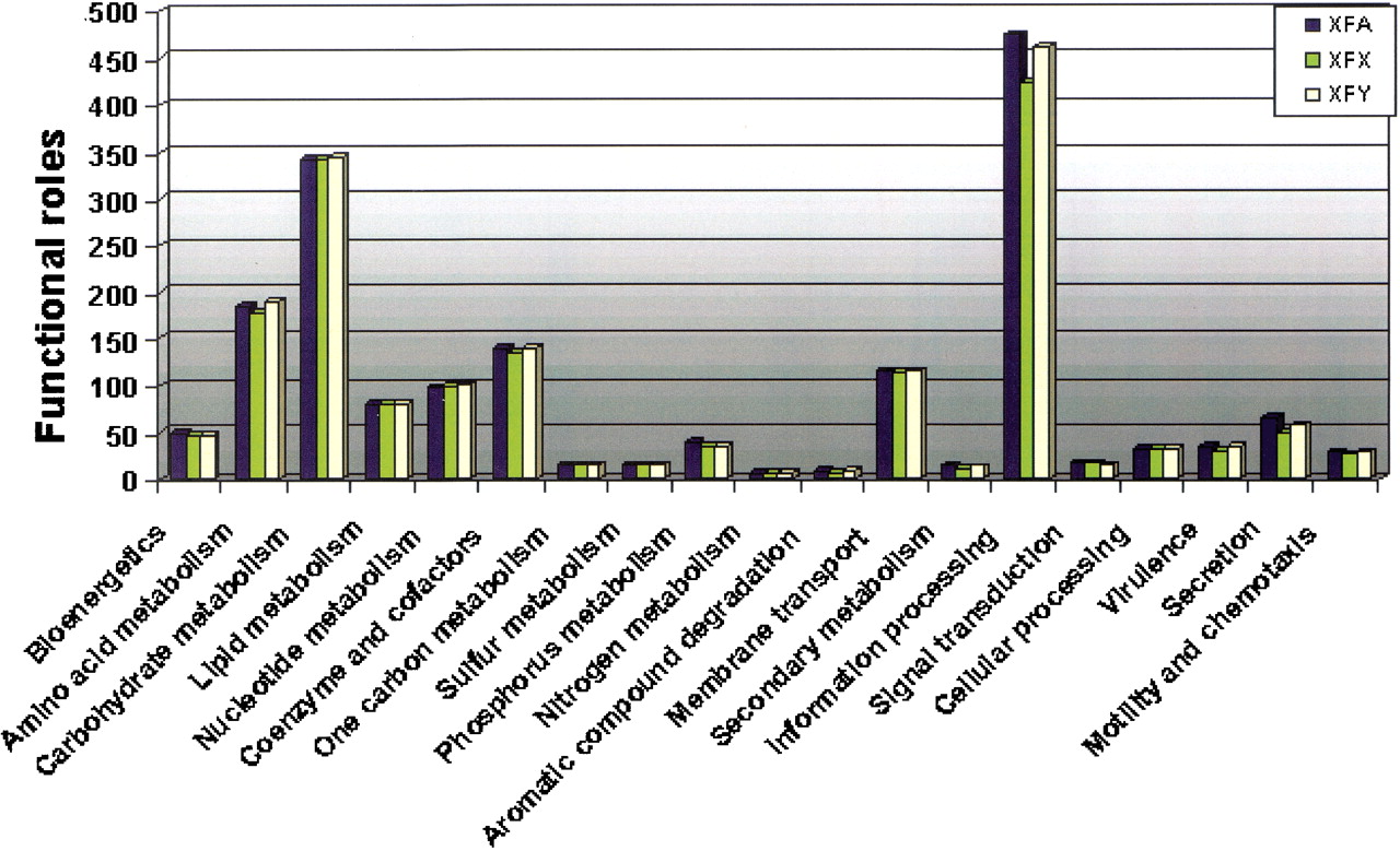 Comparative disposition of functional roles in cellular subsystems inXf genomes. The number of functional roles present in the each of the described subsystems was plotted for each of theXylella genomes.