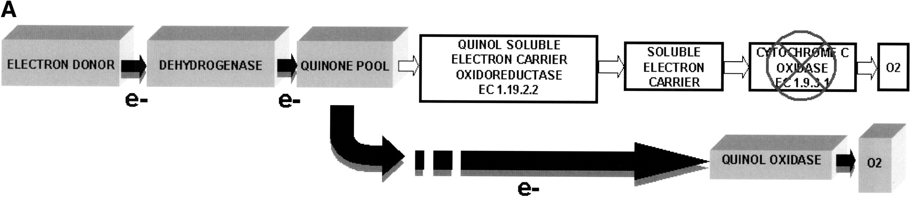 Graphical visualization of the functional reconstruction ofXylella fastidiosa aerobic and anaerobic respiration. (A) Diagrammatic representation of aerobic respiration. Three-dimensional boxes show the presence of functional components and filled arrows indicate electron flow. (B) Detailed spatial disposition of membrane components of aerobic respiratory chain. The absence of cytochrome c oxidase is designated by the cross and arrow. (C) Overview of the anaerobic respiratory chain. Reconstructions show proton translocation and oxidative phosphorylation.