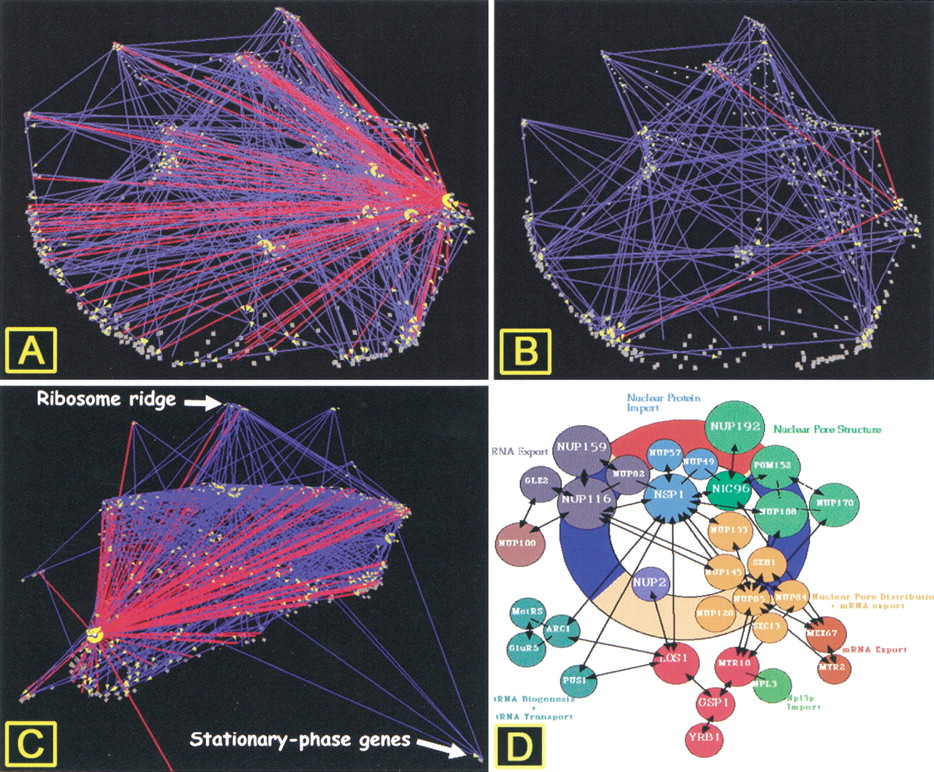 Protein-protein interactions between Nup116p and other proteins as a function of gene expression. (A) Ito's full data set: cell-cycle expression topography. (B) Schwikowski's full data set: cell-cycle topography. (C) Ito's full data set: exit from stationary phase topography. (D) Diagram of Nup116p interactions in the nuclear pore from the Munich Information Center for Protein Sequences (http://vms.gsf.de/htbin/search_code/YMR047C). (Reprinted, with permission, from E. Hurt, BZH; Universitaet Heidelberg.)