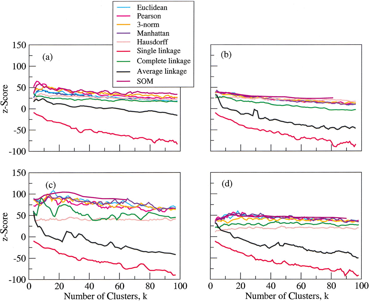 Four data sets clustered using k-means, hierarchical, and self-organized map algorithms. The horizontal axis shows the number of clusters desired, and the vertical axis shows z-scores. Data sets are (a) Cho, (b) CJRR, (c) Gasch, and (d) Spellman.