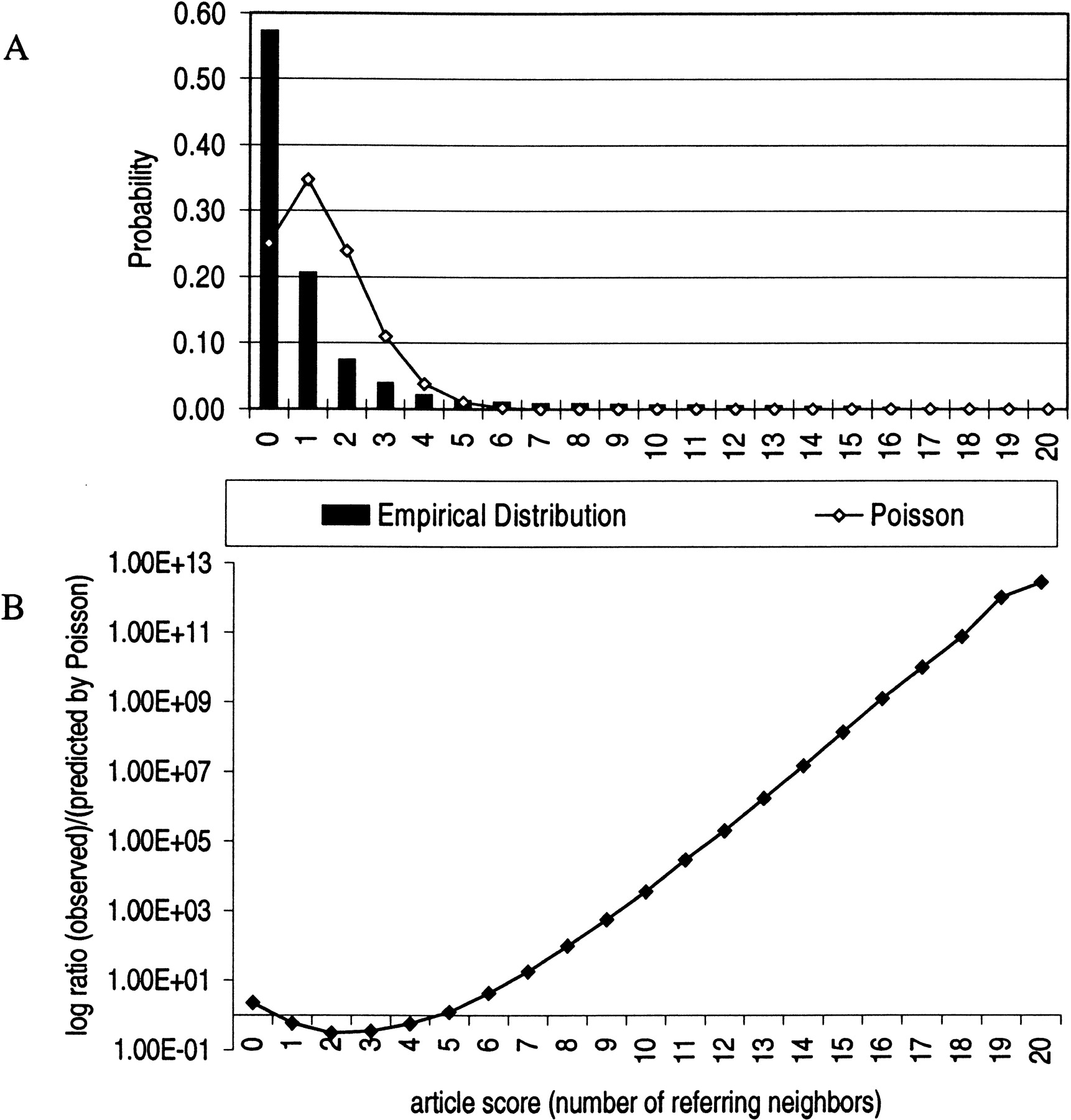 Observed and expected distribution of article scores. (A) The bar graph in the figure represents the observed empirical distribution of article scores for the “signal transduction” gene group. The line on the figure is the Poisson distribution; it is the expected distribution of scores for a random gene group of the same size. (B) The ratio in log scale of observed (bars in Fig. 4A) to expected (line in Fig. 4A) distribution of article scores. TheX-axis is drawn at a ratio of one, where observed is equal to expected. Because the gene group represents a well-defined biological function, the distributions are very different. High-scoring articles that discuss signal transduction and low-scoring articles that discuss functions besides signal transduction are overrepresented.