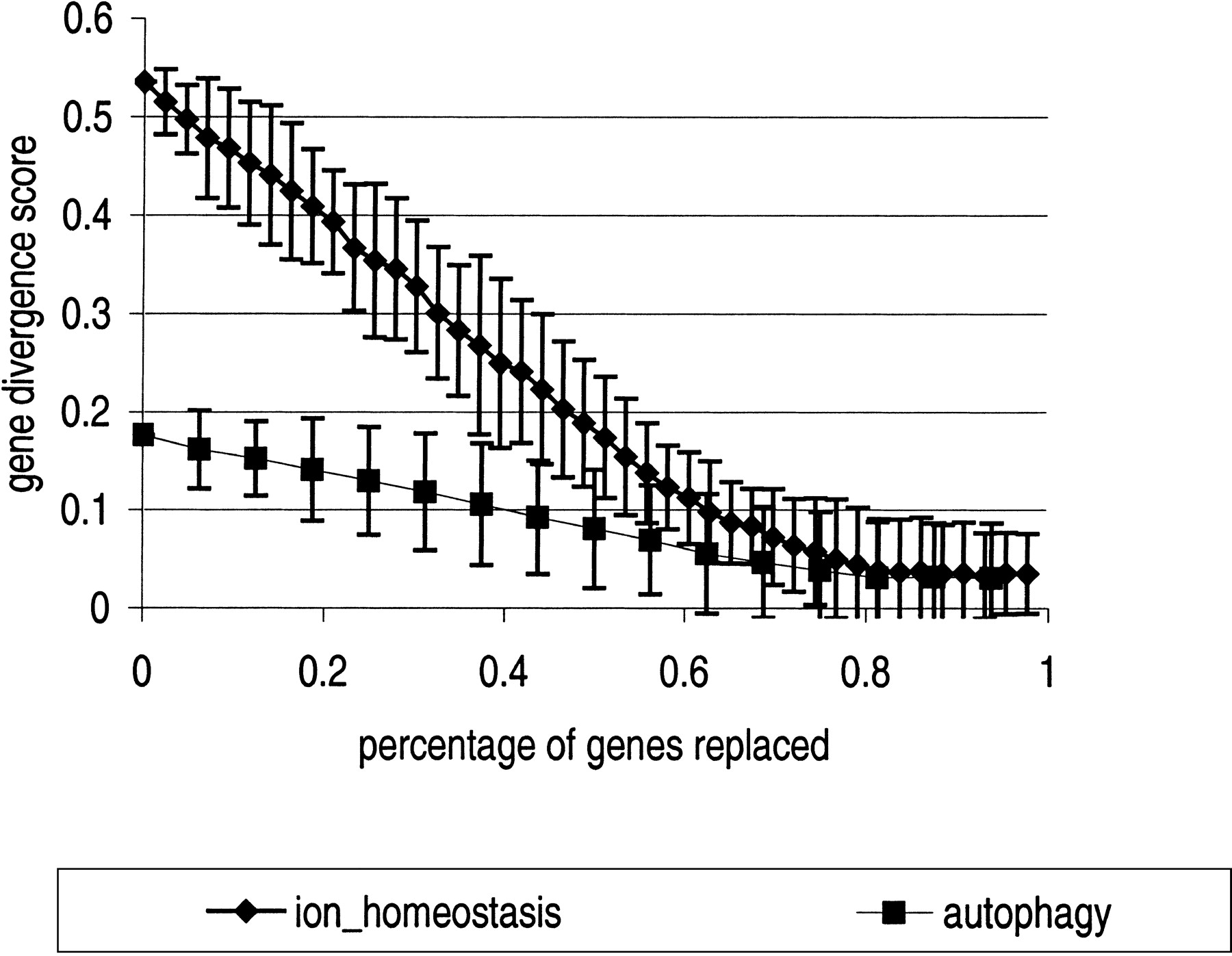 Replacing functional genes with random genes reduces neighbor divergence scores gracefully. We replaced genes in two functional gene groups (“autophagy” and “ion homeostasis”) with random genes, and scores were recalculated for the corrupted groups. Each point represents 10 scores; error bars indicate 95% confidence interval of scores for that many genes replaced. Neighbor divergence scores above .1 are very significant (see Fig. 3). Neighbor divergence scores remain significant despite replacement of about 38% (6 of 16 genes) of the “autophagy” genes and 60% (26 of 43 genes) of the “ion homeostasis” genes.