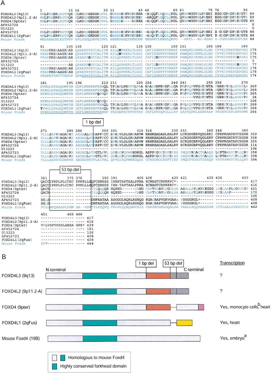 (A) Comparison of predicted amino-acid sequence of cDNA and paralogous genomic copies of forkhead FOXD4-like genes.FOXD4, FOXD4L1, FOXD4L3, andFOXD4L2 represent human forkhead domain-containing genes from 9pter, 2qFus, 9q13, and 9p11.2, respectively, derived from BAC sequences. Foxd4 is an orthologous mouse forkhead protein (fkh-2, X86368). All genes are single-exon. AF452723 andAF452724 are cDNA sequences we generated by PCR from human heart Marathon-Ready cDNAs. U13223 is a published 318-bp partial humanFOXD4 (FREAC5) cDNA (Pierrou et al. 1994). Blue residues are identical to the mouse Foxd4 protein; black residues differ from it. The underlined region indicates 100-amino-acid conserved forkhead DNA-binding domain. The locations of the 1-bp and 53-bp deletions relative to mouse Foxd4 are indicated; each causes a frame shift. Red stars indicate both stop codons. An alignment of the corresponding nucleotide sequences and locations of primers used in our analysis are in Supplemental Figure A (available online athttp://www.genome.org). (B) Summary of the putative protein structures of human FOXD4-like subfamily. Colors indicate homologous regions at the amino-acid level. Light blue blocks regions are ≥49% identical to mouse Foxd4. Green blocks are conserved forkhead domains (≥96% amino-acid identity). References for transcriptional activity are a (Kaestner et al. 1995); b (Pierrou et al. 1994); others, present study. The sequence containing FOXD4L2is tentatively assigned to 9p11.2 based on FISH results (Fan et al. 2002), but may derive from 9q13.