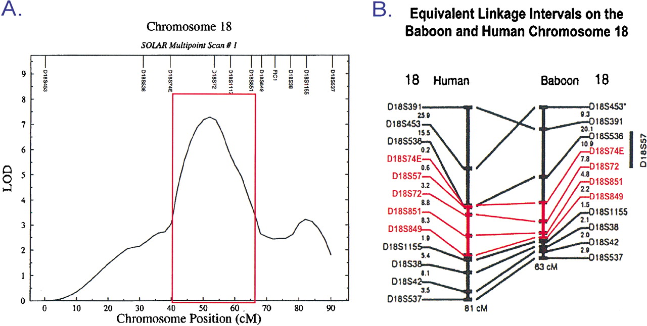 (A) Chromosome 18 map based on SOLAR multipoint scan of HDL phenotypes and microsatellite marker genotypes from 694 pedigreed baboons. Region of interest is indicated by the red box. Work published in Mahaney et al. (1998) was based on this scan (M.C. Mahaney, L.A. Cox, D.L. Rainwater, J. Blangero, C.M. Kammerer, J. Rogers, and J.L. VandeBerg, unpubl.) (B) Alignment of baboon chromosome 18 and human chromosome 18 by microsatellite markers (Rogers et al. 2000). The region of interest is shown in red.