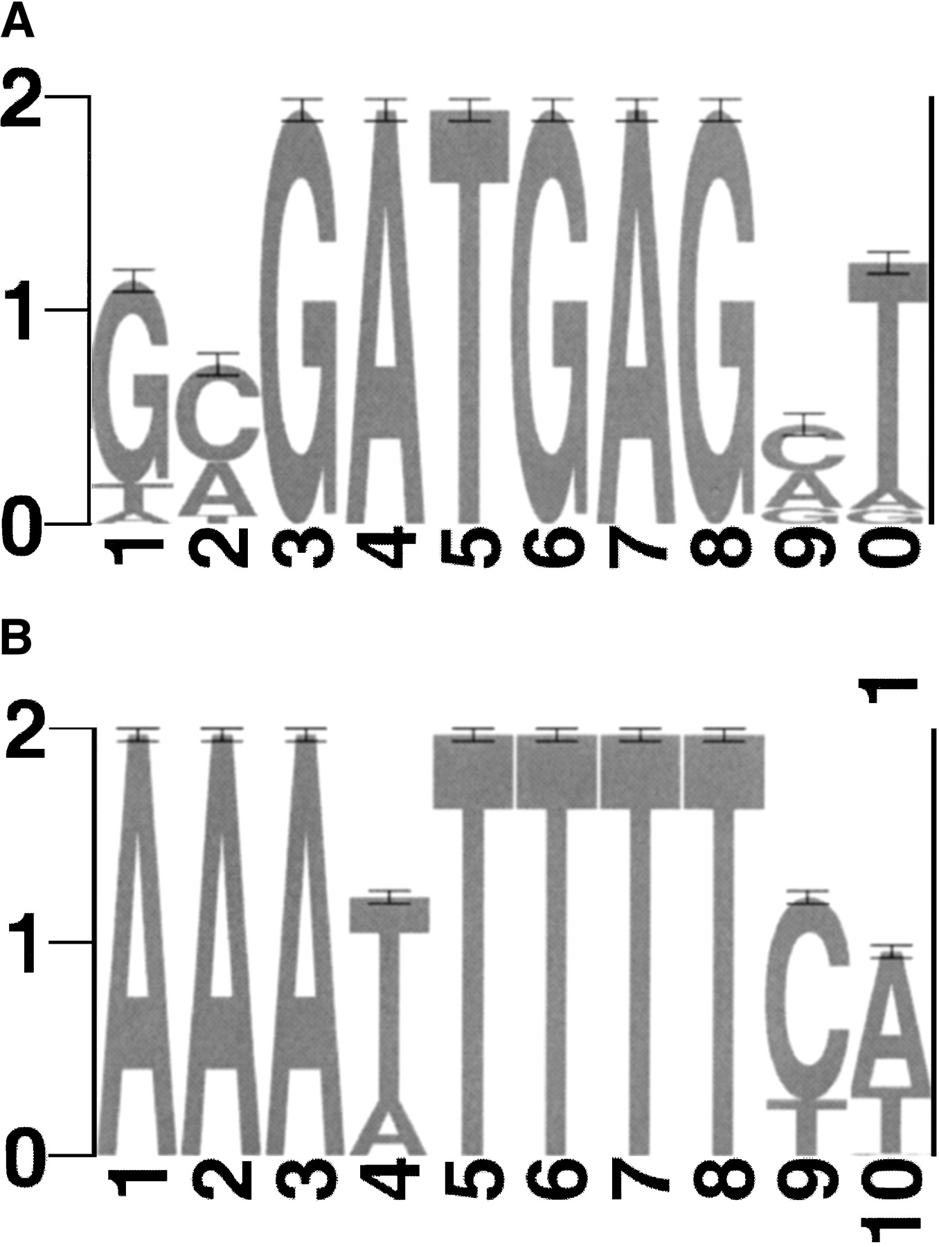 Sequence logos for (A) PAC, (B) mRRPE, (C) mRRSE10, and (D) mRRSE10, produced with the World Wide Web service athttp://www.bio.cam.ac.uk/cgi-bin/seqlogo/logo.cgi. The height of each letter is proportional to its frequency of occurrence in the binding site matrix times the information content at each position.