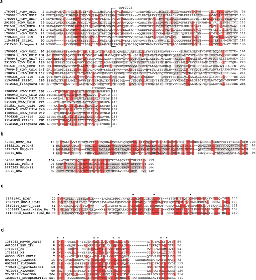 Alignment of new herpesvirus/human homologs. Proteins are labeled with GenBank identification number (GI) and a short description. Amino acids that are shaded red share identity across ≥50% of the alignment; amino acids shaded grey share similarity across ≥50% of the alignment. (a) Herpesvirus US12 protein family members, human lifeguard protein, and two additional human proteins. The Pfam UPF0005 domain is indicated. (b) HCMV UL1, two PSG proteins (PSβG 5 and 13), and one member of the carcinoembryonic antigen subfamily (NCA, nonreacting antigen). (c) A representative from each of the herpesvirus protein families found to contain C-type lectin domains and two natural killer receptors (NKG2-A). The four conserved cysteines, important for disulphide bond formation in the carbohydrate recognition domain, are indicated. (d) K3/K5 herpesvirus protein family with six human homologs. Cysteine/histidine conserved residues in the BKS (BHV-4 [bovine herpesvirus 4], KSHV, andswinepox) motif are indicated.