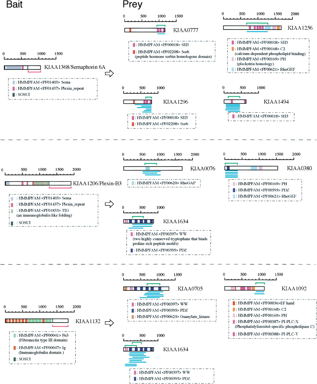 Yeast two-hybrid screening and subsequent determination of interacting domains. The domain organization for bait (left) and prey (right) KIAA proteins are shown. Blue bars indicate independent clones (one bar represents one prey). The length of the blue bar indicates the sequence of the KIAA protein contained within an isolated prey. The interacting domains located in the bait and preys are indicated by pink (bait) and green (prey) brackets. In the case of KIAA1634, we estimated that KIAA1132 can bind two different domains: the first and second PDZ domain, as shown.