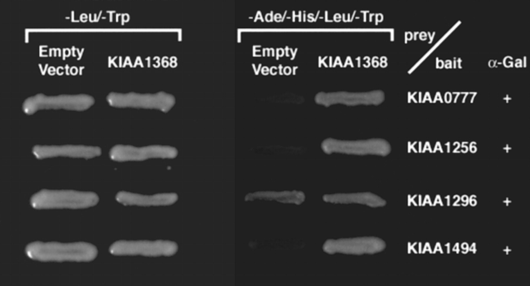 Reassessment of interactions after exchanging cDNAs in baits and preys via the Gateway system. Image of yeast two hybrids grown on selection media. After exchanging the plasmids contained in the original bait and prey using the Gateway system, new bait plasmids (KIAA0777, KIAA1256, KIAA1296, or KIAA1496), new prey plasmid (KIAA1368), and an empty vector (pACTGW-attR) were transformed into yeast AH109. The viability of the transformants was assessed on SD/−Leu/−-Trp and SD/−Ade/−His/−Leu/−Trp plates. The + symbol located in the right-hand column indicates that the MEL1 gene product, α-galactosidase, is actively expressed. Blue-colored growth on nutritional selection plates in the presence of X-α-Gal indicates active expression of α-galactosidase.