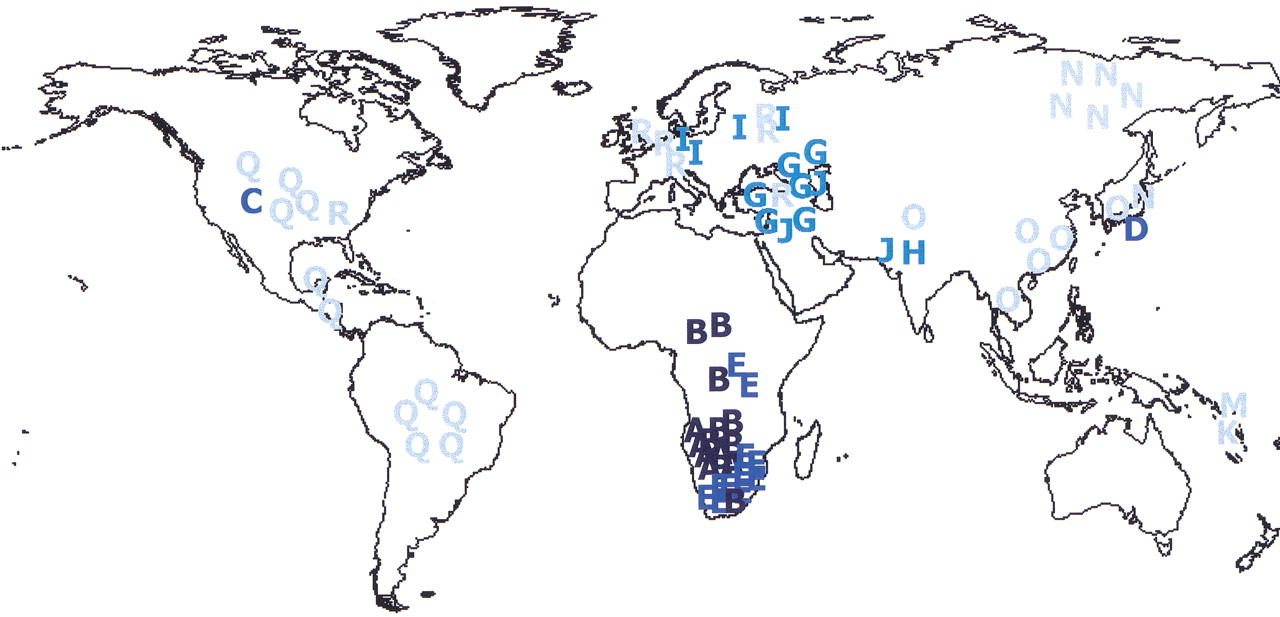 Haplogroups and geographic origins of all individuals in the Y Chromosome Consortium (2002) collection. It comprises the 74 individuals from Table 1 in The Y Chromosome Consortium (2002). Haplogroups are depicted according to the letter proposed as nomenclature by the YCC, with four intensities of color according to their position in the phylogenetic tree (in four decreasing intensity classes: haplogroups A and B, C through E, F through J, and K through R).