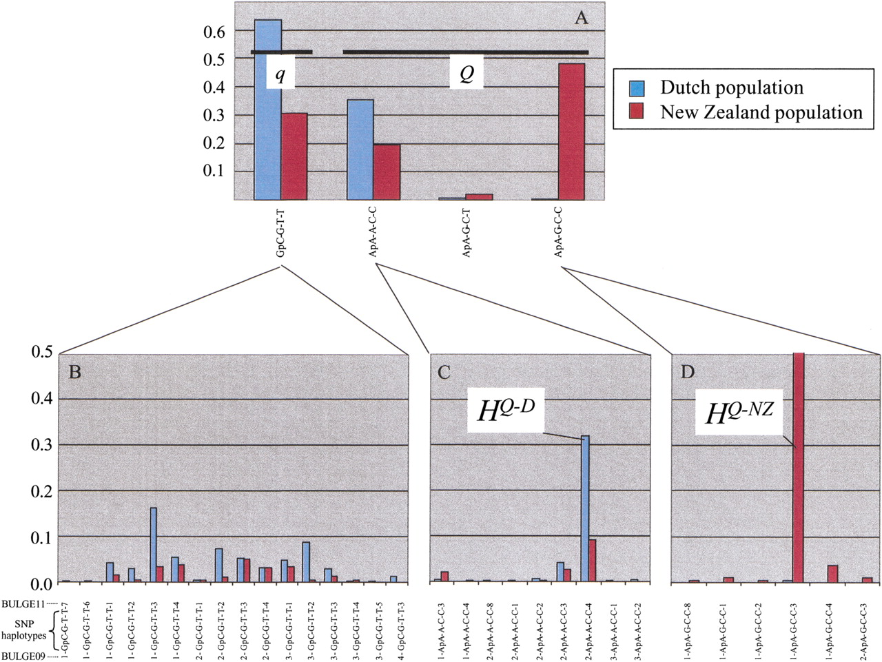 (A) Frequency distribution of observed DGAT1 SNP haplotypes in the Dutch (blue) and New Zealand (red) Holstein-Friesian dairy cattle populations. The correspondence with the previously defined “Q” and “q” QTL alleles (Farnir et al. 2002) is shown. (B–D) Frequency distribution of the combined microsatellite (BULGE09-BULGE11) andSNP DGAT1 haplotypes. The previously definedHQ-D and HQ-NZ haplotypes (Farnir et al. 2002) are shown.