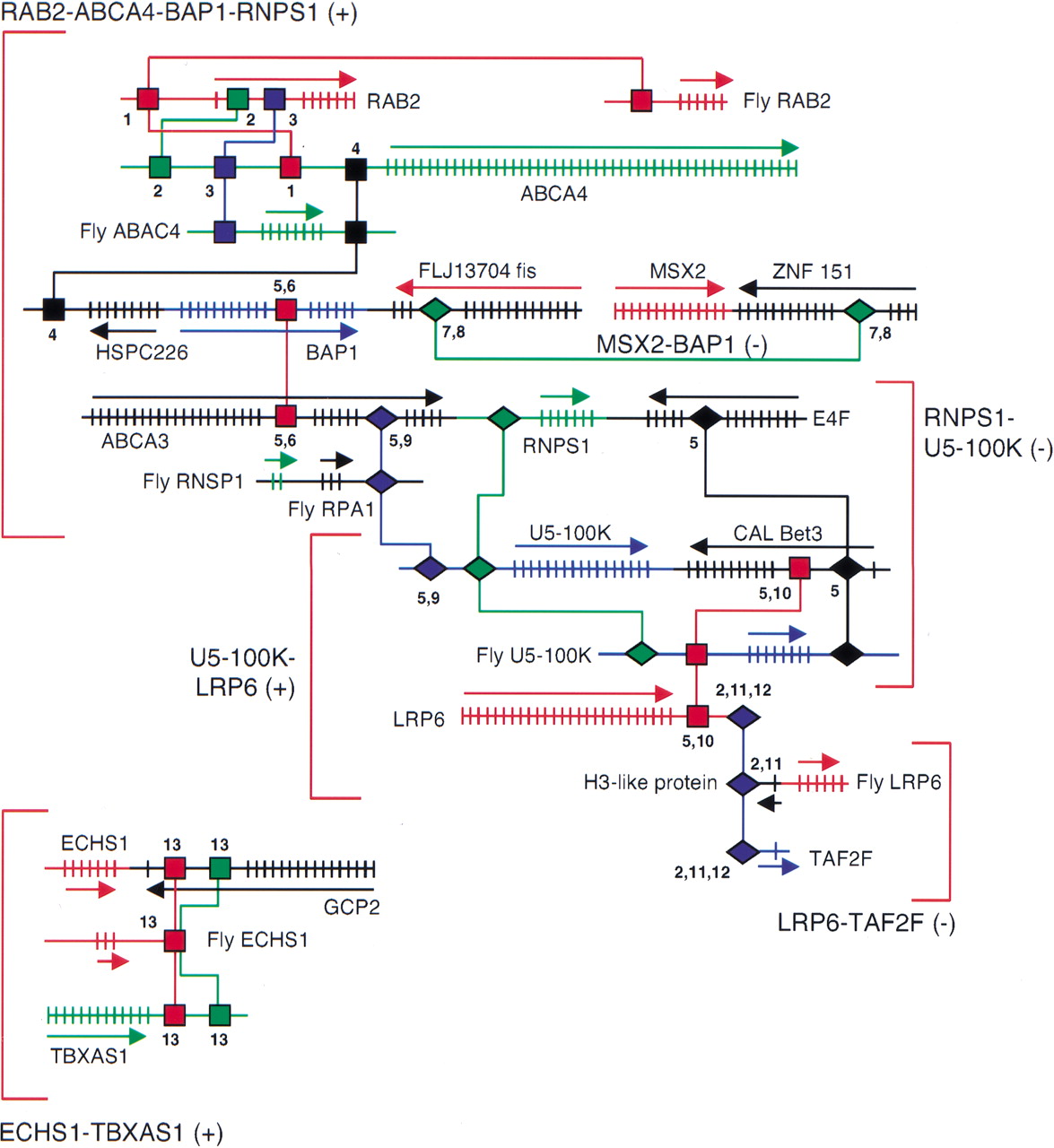 Putative regulatory elements shared between groups of correlated and anticorrelated genes. There were three groups of correlated (+) genes: (1) RAB2, ABCA4, BAP1, RNPS1, (2) U5-100K, LRP6, (3) ECHS1, TBXAS1; and three groups of anticorrelated (−) genes: (1) BAP1, MSX2 (2) RNPS1, U5-100K (3) LRP6, TAF2F. The groups are indicated by square brackets. The regulatory sequences responsible for correlated expression are shown as squares, those responsible for anticorrelated expression are shown as diamonds. Genes are indicated by UniGene symbol or name (http://www.ncbi.nlm.nih.gov/UniGene). Exons are indicated by short vertical lines. Lines delineate the relationships between the conserved regulatory sequences. Multiple control regions frequently connected the genes. Sometimes these control regions were found in introns or flanking regions of adjacent genes. In that case, where there was a Drosophila ortholog of the relevant gene, the control region was conserved in the Drosophila genome but in a different context. Potential binding sites are: (1) OCT-1, (2) HFH8, (3) TFIID, (4) AP1, (5) IK2, (6) Sp1, (7) USF, (8) MYOD, (9) GKLF, (10) IK1, (11) HFH3, (12) XFD1, and (13) AP4.