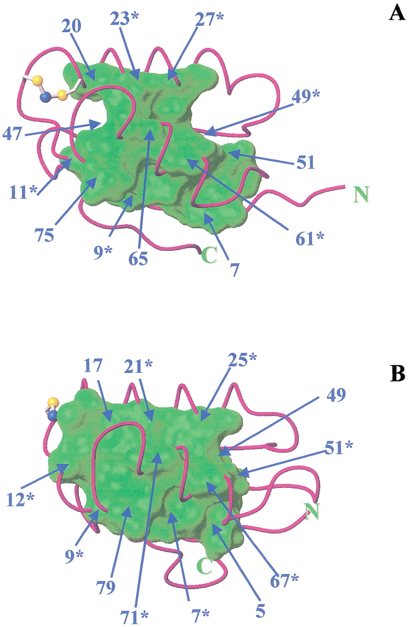 Hydrophobic core of structural models of metallochaperones and soluble metal transporters (A) and of ATPase soluble domains (B), defined as the van der Waals surface formed by atoms of residues that are buried in more than 70% structures. These residues are indicated in the figure. Conserved hydrophobic amino acids are marked with *.