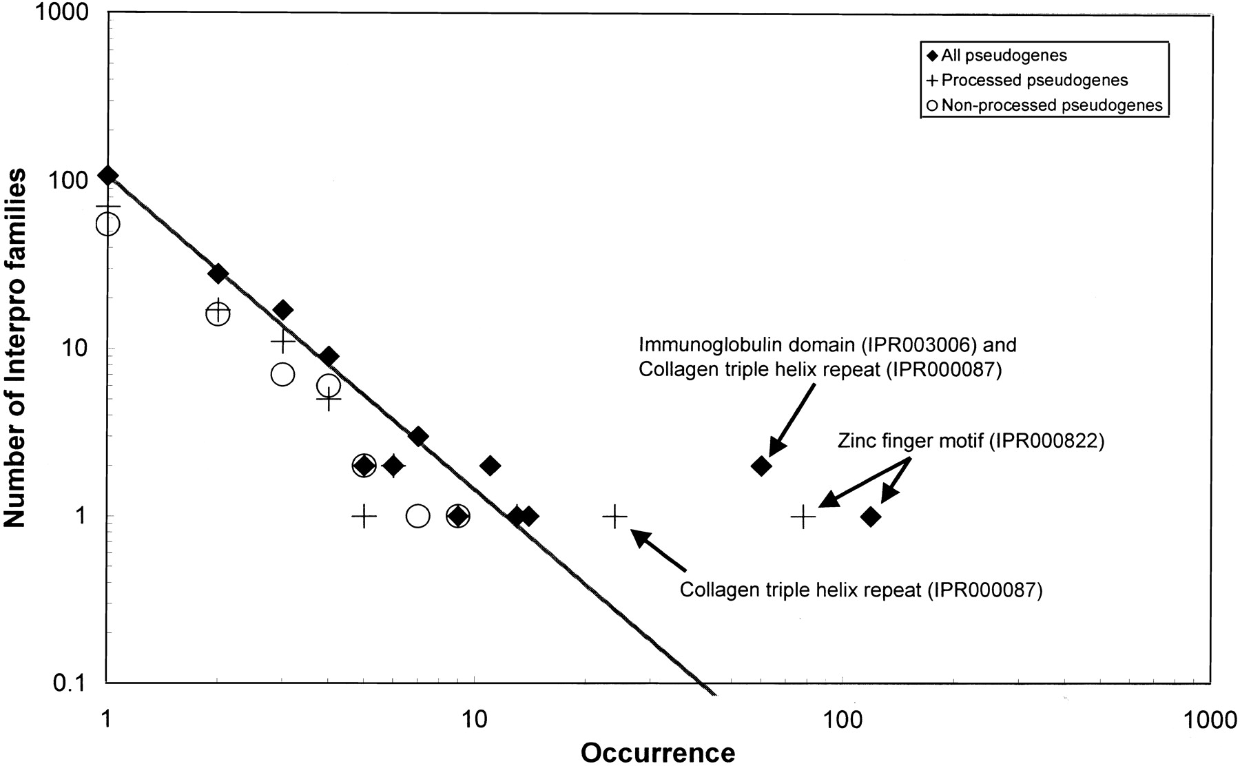 The relationship between the number of InterPro families for pseudogenes and their sizes shows a power–law behavior. The number of InterPro families is plotted vs. the size of a family on a log–log scale. “All pseudogenes” (processed and nonprocessed combined) are plotted with a filled diamond, processed pseudogenes with a cross, and nonprocessed pseudogenes with an unfilled circle. The straight line indicates the best least-squares linear fit to all points for all pseudogenes, except for the outliers that are labeled in the plot. This is indicative of a power–law relationship between the size of a protein family and the number of families that have this size.