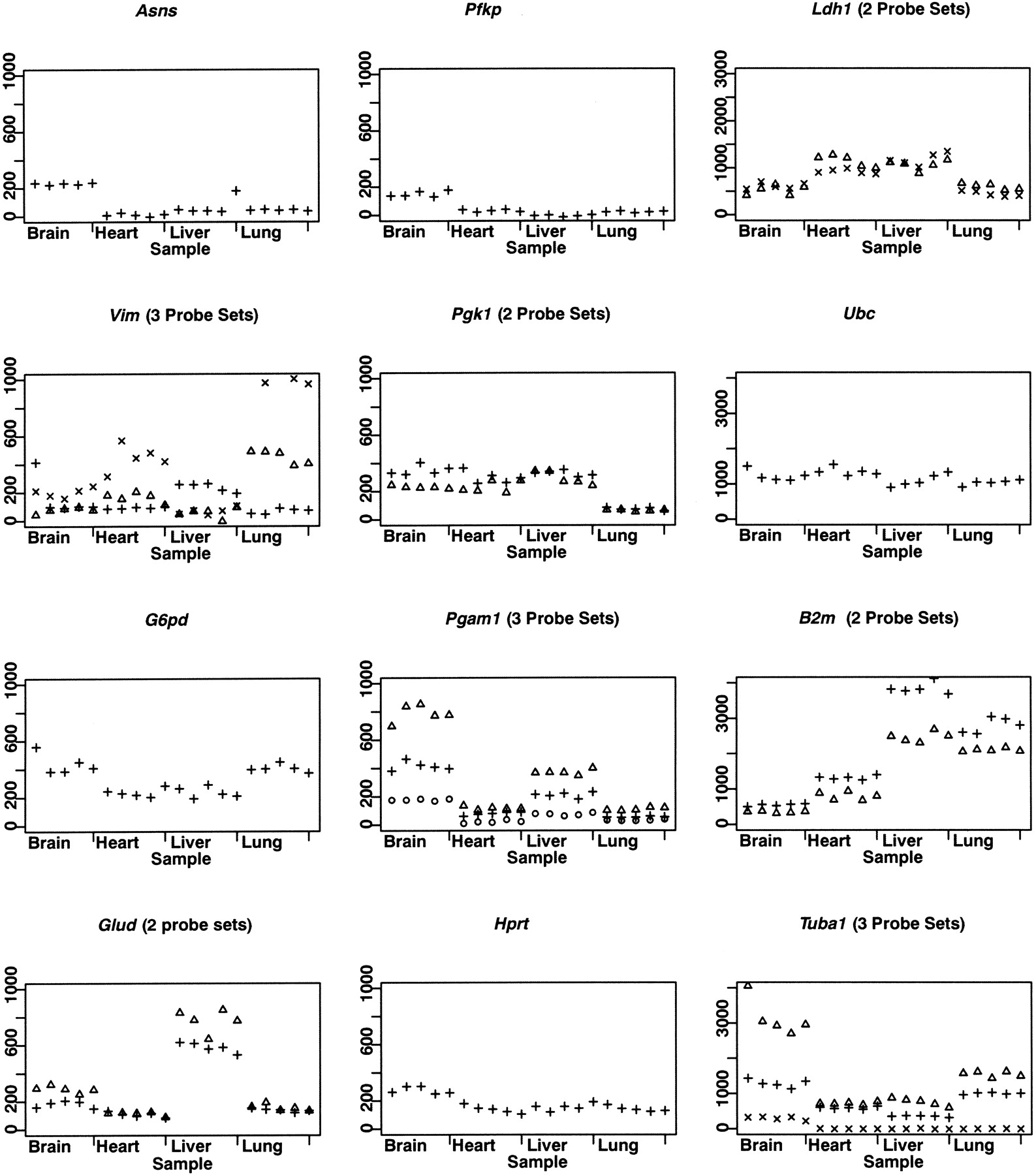 Replicate samples from four mouse tissues. RNA was extracted from the liver, heart, lung, and brain of three adult male C57BL/6 mice. To assess technical variability, we divided the RNA from each tissue of one mouse and hybridized it in replicate to three separate arrays. To assess biological variability, we hybridized RNA from identical tissues of three individual mice to three separate arrays. Points are arranged in the following order for each tissue: mouse1-replicate1, mouse1-replicate2, mouse1-replicate3, mouse2-replicate1, mouse3-replicate1. Multiple probe sets, present for Glud,Pgk1, Pgam1, and Ldh1, show consistency in measurements of expression levels across tissues. Other probe sets forTuba1, Vim, and B2m show a higher degree of variability, indicating issues inherent in probe design. Samples were normalized by mean intensity per scan.