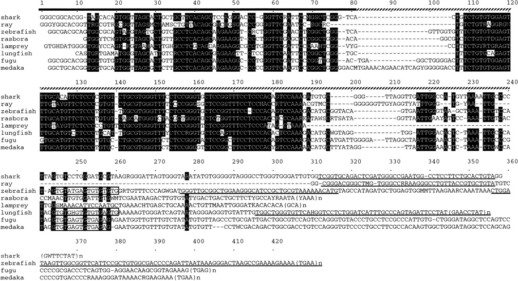 Characterization of V-SINEs. Consensus sequences of several V-SINEs from vertebrates are aligned and compared. The consensus sequences are from the gummy shark (Mustelus manazo) HE1 SINE (Ogiwara et al. 1999), electric ray (Torpedo californica) HE1 SINE (Ogiwara et al. 1999), zebrafish (Danio rerio) DANA SINE (Izsvak et al. 1996), rasbora (Rasbora pauciperforata) Ras1 SINE (this study), lamprey (Lethenteron reissneri) Lam1 SINE (this study), lungfish (Lepidosiren paradoxa) Lun1 SINE (this study), fugu (Fugu rubripes) Ac1 SINE (this study), and medaka (Oryzias latipes) Ac1 SINE (this study). Consensus sequences were deduced from six (zebrafish), three (rasbora), five (lamprey), five (lungfish), three (fugu), and two (medaka) sequences, respectively (see Supplemental Fig. 2, available online at http://www.genome.org). Nucleotides are numbered above the sequences. Under the numbers, the tRNA-related regions and the central conserved domains are indicated by a bold line and by a dotted line, respectively. (TG)n tracts are boxed. Nucleotide sequences in 3′ tails that are nearly identical to those of partner LINEs are underlined. Nucleotides are highlighted in black when at least six are identical at a given position.