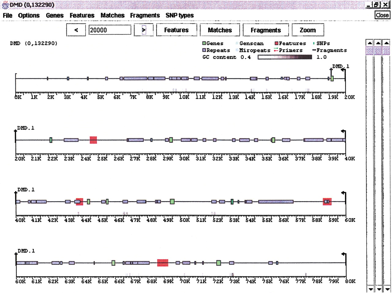 The Features subwindow: Data from GenBank record AL031542, containing 13 exons of the human dystrophin gene, is shown with green boxes representing the exons of “CDS” tags, blue boxes representing “repeat region” tags, and red areas defining “misc feature” tags. The user can click on any box and obtain details about the feature, control which types and classes of features are displayed, and label features. Grey bars above the scale denote areas where sequence GC content is above a threshold value (in this case,40%).