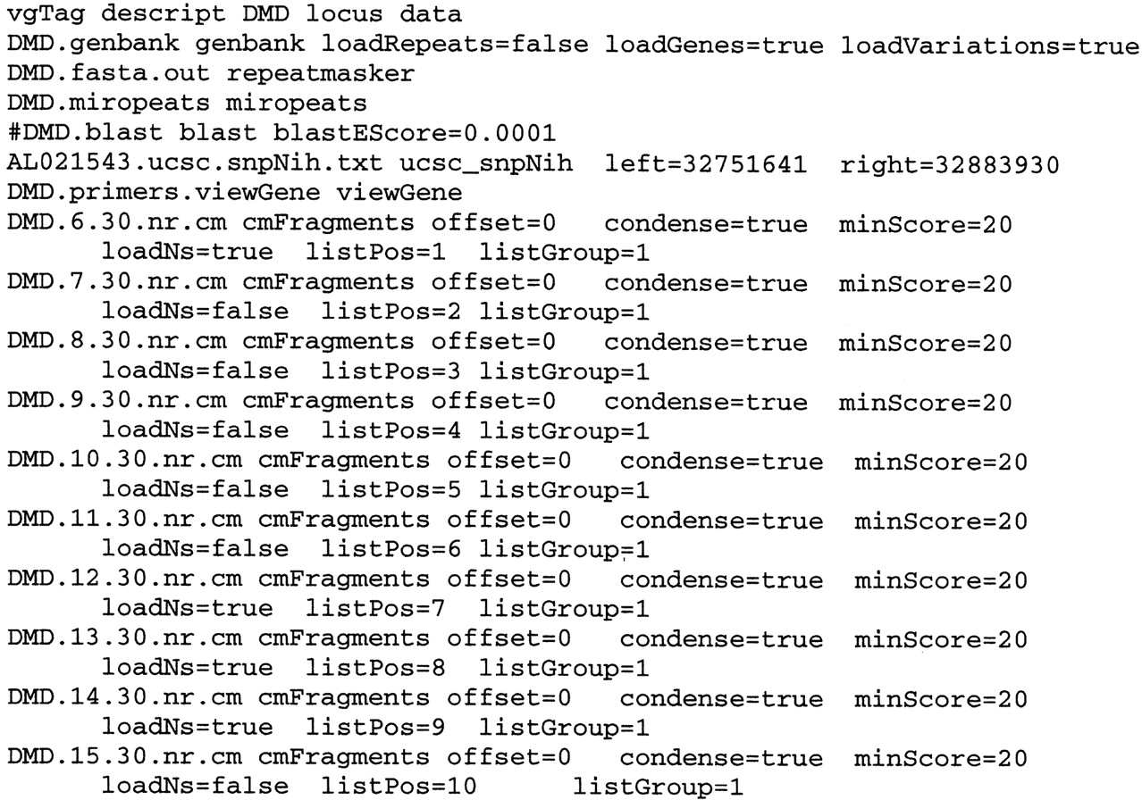viewGene assembly file. The file shown was used to generate Fig. 4. The example has been truncated; the actual file contains 96 cmFragment lines corresponding to the DNA samples used. Each type of output file has several options associated with it, including grouping of related information and controlling loading of information based on quality scores. The file DMD.primers.viewGene contains custom data items in a simple format that can be easily generated by the user from most input sources. Details on the different file types and options forviewGene assembly files, as well as several examples and scripts used for formatting, are available from theviewGene web page.