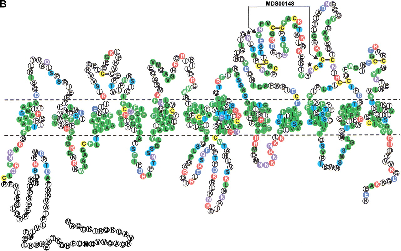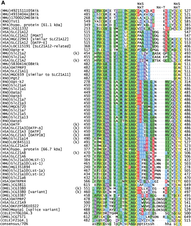 (A) Multiple sequence alignment of extracellular domain containing the OATP family motif MDS00148. The proteins are designated by the species abbreviation and the name. The positions of motif MDS00148 are designated by “+”. Potential N-glycosylation sites N-x-[ST] are indicated. A multiple sequence alignment of MDS00148 representatives covering the entire sequence length and a phylogenetic tree are shown in Suppl. Fig. 3A and B. The SWISS-PROT/TrEMBL accessions of the sequences are as follows: (MMU)4921511I05Rik, Q9D5W6; (MMU)4933404A18Rik, Q9D4B7; (MMU)1700022M03Rik, Q9DA23; (RNO)Tst1,AAK63015; (MFA)hypo. protein [61.1 kD], BAB69708; (DMEL)CG11332, Q9I7P1; (HSA)SLC21A12, Q9H4T8; (HSA)SLC21A12 [POATP], Q9UI35; (HSA)MGC22943 [similar to SLC21A12], AAH15727; (HSA)SLC21A12 [OATP-E], Q9UIG7; (HSA)LOC115191 [SLC21A12-related], Q9H8P2; (RNO)Oatp-e, Q99N01; (MMU)Slc21a2, Q9EPT5; (RNO)Slc21a2, Q00910; (HSA)SLC21A2, Q92959; (MMU)5830414C08Rik, Q9JKV0; (HSA)OATPRP3, Q9GZV2; (HSA)SLC21A11, Q9UIG8; (HSA)MGC659 [similar to SLC21A11], Q9BW73, (RNO)Pgt2, Q99N02; (RNO)Oat-k2, Q9WTM0; (RNO)Slc21a4, P70502; (MMU)Slc21a1, Q9QXZ6; (RNO)Oatp2, O35913; (RNO)Oatp3, O88397; (RNO)Slc21a7, Q9EQR8; (RNO)Slc21a3, P46720; (MMU)MGC6720, AAH13594; (MMU)Slc21a7, AAK39416; (MMU)Slc21a5, Q9EP96; (MMU)Slc21a13, Q99J94; (RNO)Oatp5, Q9QYE2; (HSA)OATP, AAG30037; (HSA)SLC21A3 [OATP-A],CAB97006; (HSA)SLC21A3 [OATP], P46721; (HSA)SLC21A3 [OATP1B], Q9UL38; (MMU)Slc21a14, Q9ERB5; (RNO)LOC845111, Q9EPZ7, (HSA)SLC21A14, Q9NYB5; (MFA)hypo. protein [66.7 kD], Q9GMU6; (HSA)SLC21A8, Q9NPD5; (HSA)SLC21A6, Q9Y6L6; (MMU)Slc21a10(MLST-1), Q9JJJ1; (MMU)Slc21a10(Lst-1), Q9JJL3; (MMU)MG1351894, Q9JI79; (RNO)Slc21a10(Lst-1a), Q9JHF6; (RNO)Slc21a10(Lst-1c), Q9JIM2; (RNO)Slc21a6, Q9QZX8; (HSA)OATRPR4, Q9H2Y9; (DMEL)CG3811, Q9VLB3; (DMEL)CG3380, Q9W269; (DMEL)CG3380 [variant], AAK77236; (DMEL)CG3387, Q9W271; (HSA)OATPRP2, Q9H2Z0; (HSA)SLC21A9, O94956; (HSA)DKFZP586I0322, Q9UFU1; (RNO)moatp1 [splice variant], Q9JHI3; (CELE)Y70G10A.3, Q9XWC5; (DMEL)CG7571, Q9VVH9; and (CELE)F21G4.1, Q93550. Motif sequences that contain an hmmpfam-predicted kazal-type serine protease inhibitor domain are labeled with a “k”. (B) Proposed topology of an organic anion transporter. The primary structure is shown for 4921511I05Rik, assuming 12 transmembrane helices. The intra- and extracellular domains are separated by horizontal dashed lines, which symbolize the cell membrane. The motif region MDS00148 is indicated by arrows. Potential extracellular N-glycosylation sites are symbolized by asterisks. Potential disulfide bonds of Cys residues are shown as double lines.