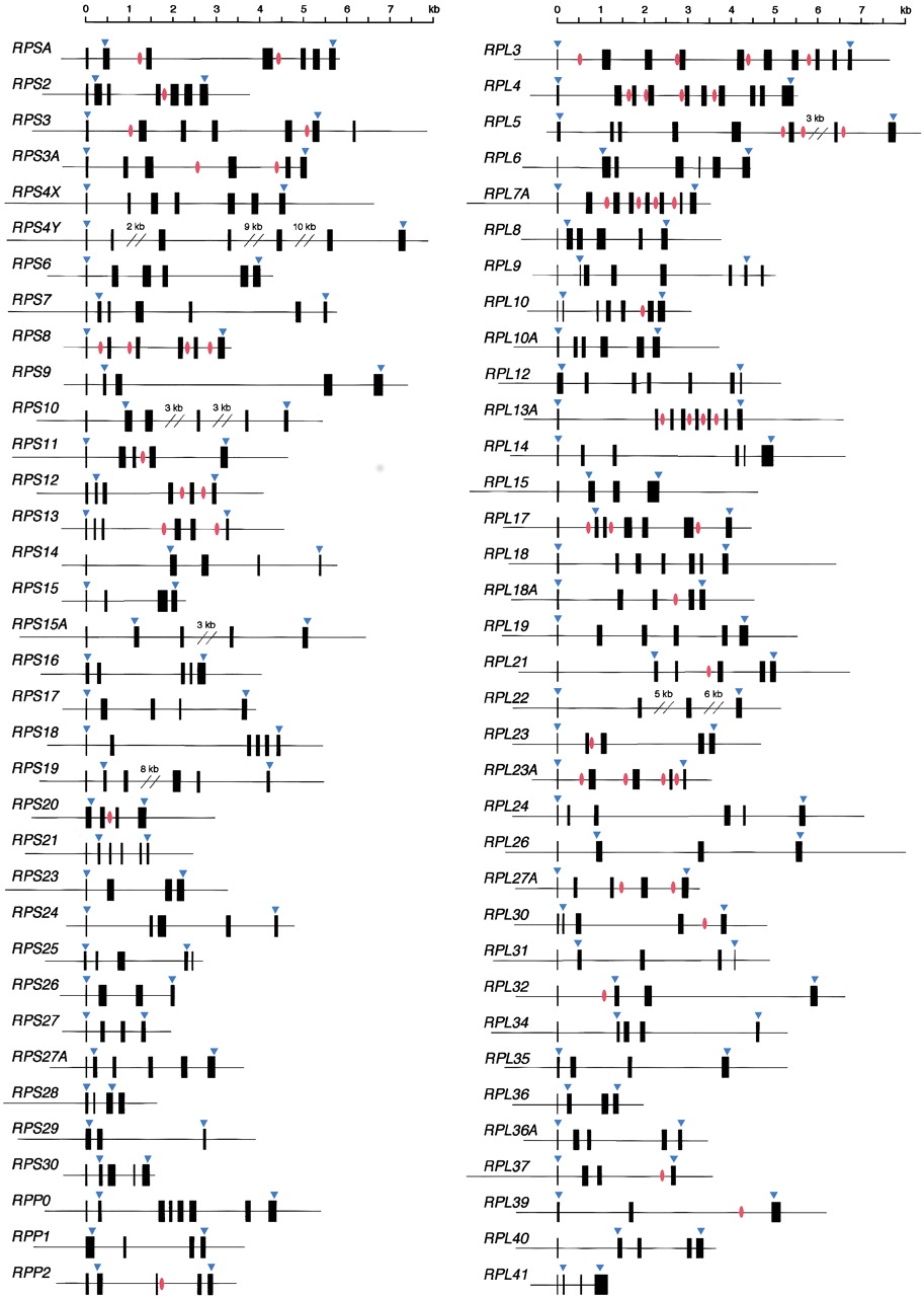 Schematic representation of RP gene organization. Solid boxes indicate exons. Arrowheads show the position corresponding to the translation start and stop sites. Red circles represent the position of the snoRNA genes.